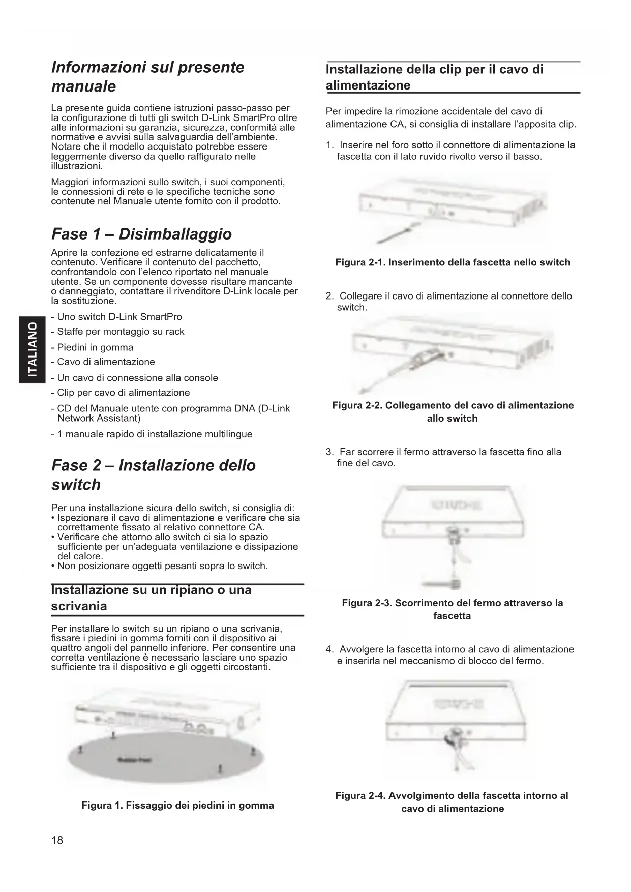 Fase 3: Alla comparsa della nestra di dialogo riportata di seguito, lasciare i campi Nome utente e Password vuoti e scegliere la lingua dell’interfaccia di gestione basata su Web, quindi fare clic su Login (Accedi). Figura 8. Finestra di autenticazione dell’utente Fase 4: Prima di accedere alla Gestione basata su Web, la Procedura guidata assisterà l’utente nella congurazione rapida di alcune funzioni come, ad esempio, le informazioni IP e le impostazioni SNMP. Se non si desidera effettuare modiche, fare clic su Esci per uscire dalla procedura guidata e avviare la gestione basata sul Web. Per informazioni dettagliate sulle funzioni della procedura guidata Smart Wizard, fare riferimento al relativo capitolo introduttivo presente nel manuale dell’utente. DNA (D-Link Network Assistant) DNA (D-Link Network Assistant), incluso nel CD di installazione, è un programma per il rilevamento di smart switch con lo stesso segmento di rete L2 collegati al PC. Questo strumento è in grado di supportare Windows 2000, Windows XP, Vista e Windows 7. DNA (D-Link Network Assistant) può essere installato in due diversi modi, ovvero tramite il programma di esecuzione automatica incluso nel CD di installazione oppure manualmente. Opzione 1: attenersi alla procedura seguente per installare DNA (D-Link Network Assistant) tramite il programma di esecuzione automatica incluso nel CD di installazione.