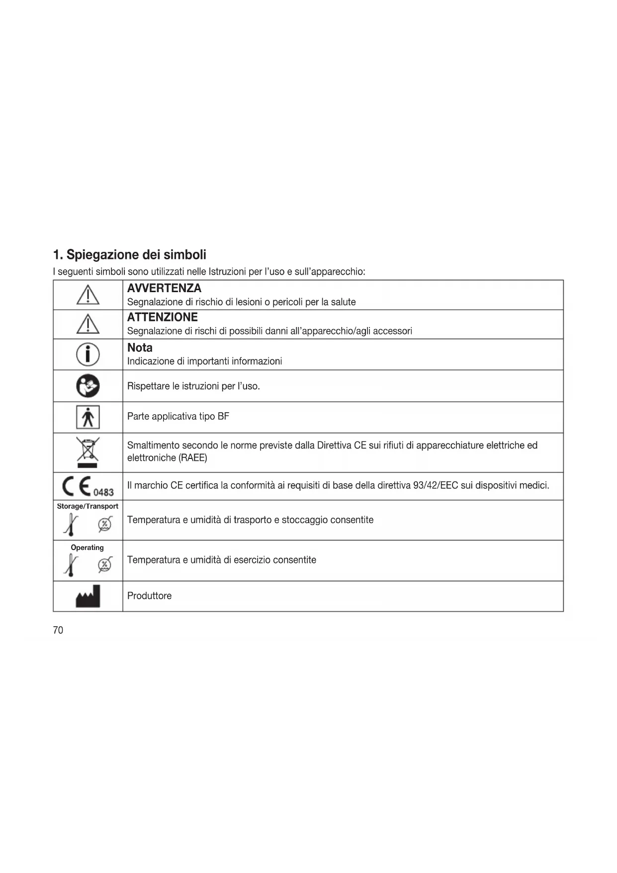 I seguenti simboli sono utilizzati nelle Istruzioni per l’uso e sull’apparecchio: AVVERTENZA Segnalazione di rischio di lesioni o pericoli per la salute ATTENZIONE Segnalazione di rischi di possibili danni all’apparecchio/agli accessori Nota Indicazione di importanti informazioni Rispettare le istruzioni per l’uso. Parte applicativa tipo BF Smaltimento secondo le norme previste dalla Direttiva CE sui rifiuti di apparecchiature elettriche ed elettroniche (RAEE) Il marchio CE certifica la conformità ai requisiti di base della direttiva 93/42/EEC sui dispositivi medici. Storage/Transport Temperatura e umidità di trasporto e stoccaggio consentite Operating Temperatura e umidità di esercizio consentite Produttore71
