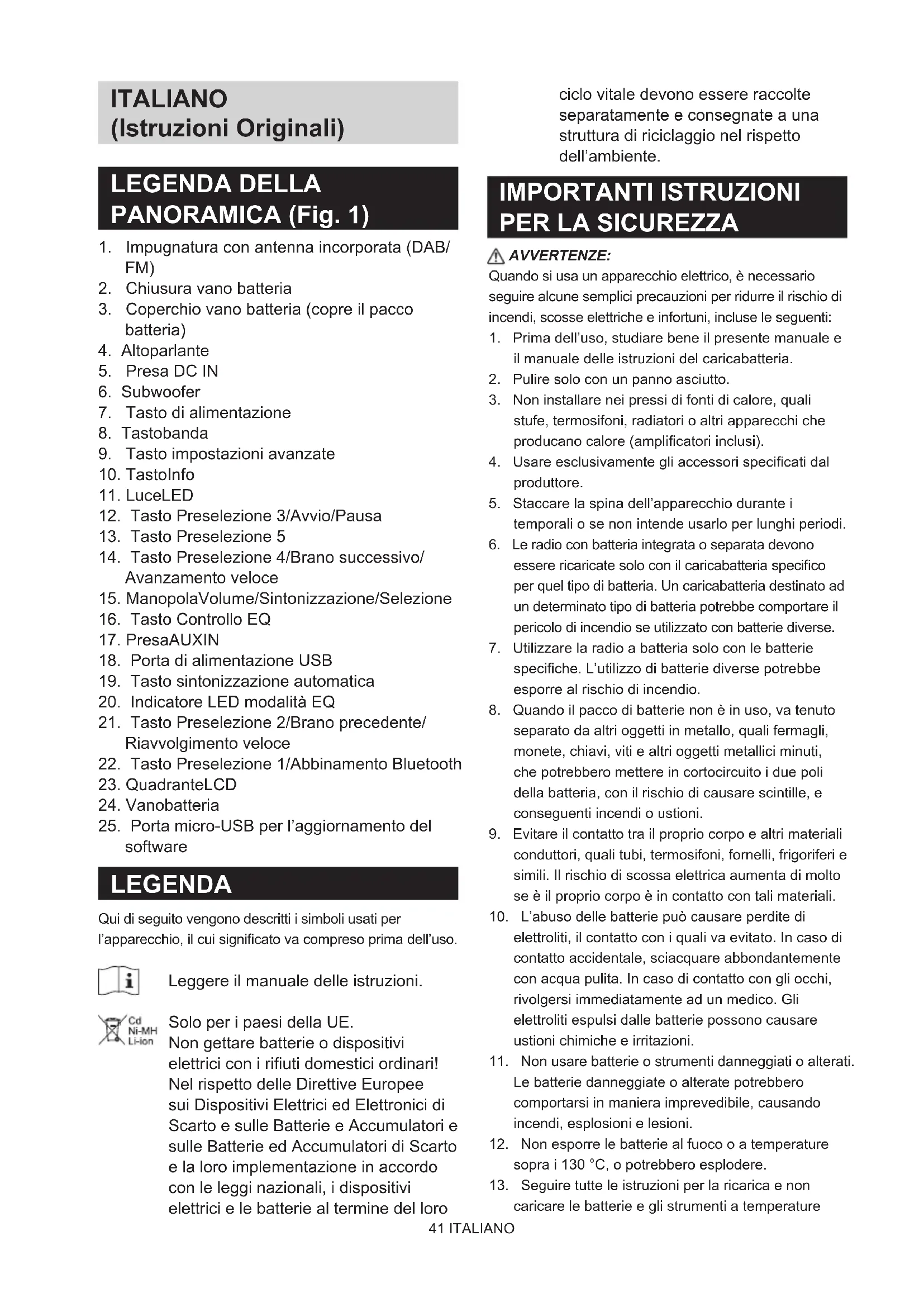 e il relativi logo sono proprietà registrata di Bluetooth SIG, Inc.) Versione Bluetooth 5.0 Certicata Proli Bluetooth A2DP/SCMS-T/AVRCP Potenza trasmissione Classe di Potenza 2 Raggio trasmissione Ottimale: Max.10 metri Possibile: Max. 30 metri (varia a seconda delle condizioni) Codec Bluetooth SBC, AAC Potenza massima in radio frequenza BT EDR: 1.91dBm BT LE: 0.21dBm Frequenza operativa 2402MHz~2480MHz Caratteristiche Altoparlante 2,5” 8Ω x 2 4” 6 Ω x 1 Potenza in uscita 10,8~12V max.: 2W x 2 + 10W 14,4V: 3W x 2 + 15W 18V: 5W x 2 + 25W Terminale di input 3,5mm (AUX IN) Antenna DAB/FM: Antenna incorporata Dimensioni in mm (L x P x A) 268 x 164 x 295 Peso 4,8kg (senza batteria)52 NEDERLANDS NEDERLANDS (Originele gebruiksaanwijzing) OVERZICHT BELANGRIJKSTE ONDERDELEN (Fig. 1)
