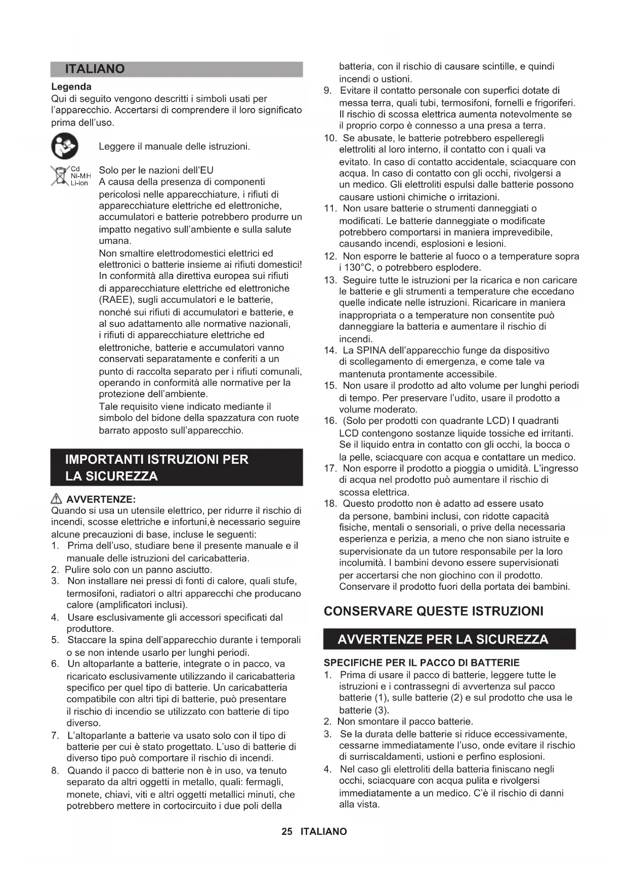 ricaricato esclusivamente utilizzando il caricabatteria specico per quel tipo di batterie. Un caricabatteria compatibile con altri tipi di batterie, può presentare il rischio di incendio se utilizzato con batterie di tipo diverso.