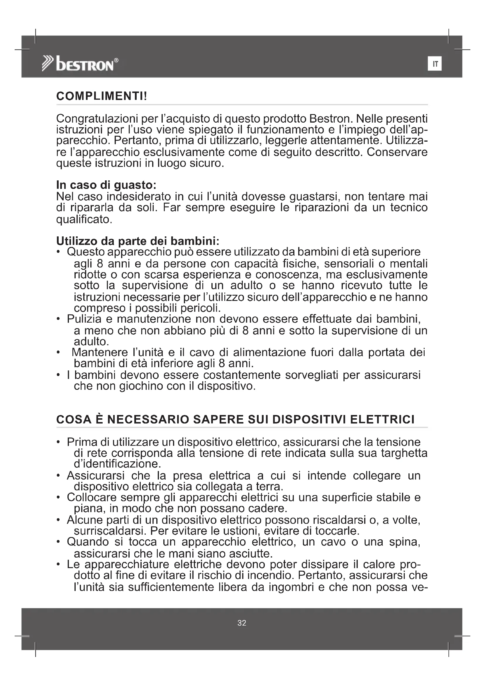 COMPLIMENTI! Congratulazioni per l’acquisto di questo prodotto Bestron. Nelle presenti istruzioni per l’uso viene spiegato il funzionamento e l’impiego dell’ap- parecchio. Pertanto, prima di utilizzarlo, leggerle attentamente. Utilizza- re l’apparecchio esclusivamente come di seguito descritto. Conservare queste istruzioni in luogo sicuro. In caso di guasto: Nel caso indesiderato in cui l’unità dovesse guastarsi, non tentare mai di ripararla da soli. Far sempre eseguire le riparazioni da un tecnico qualificato. Utilizzo da parte dei bambini: