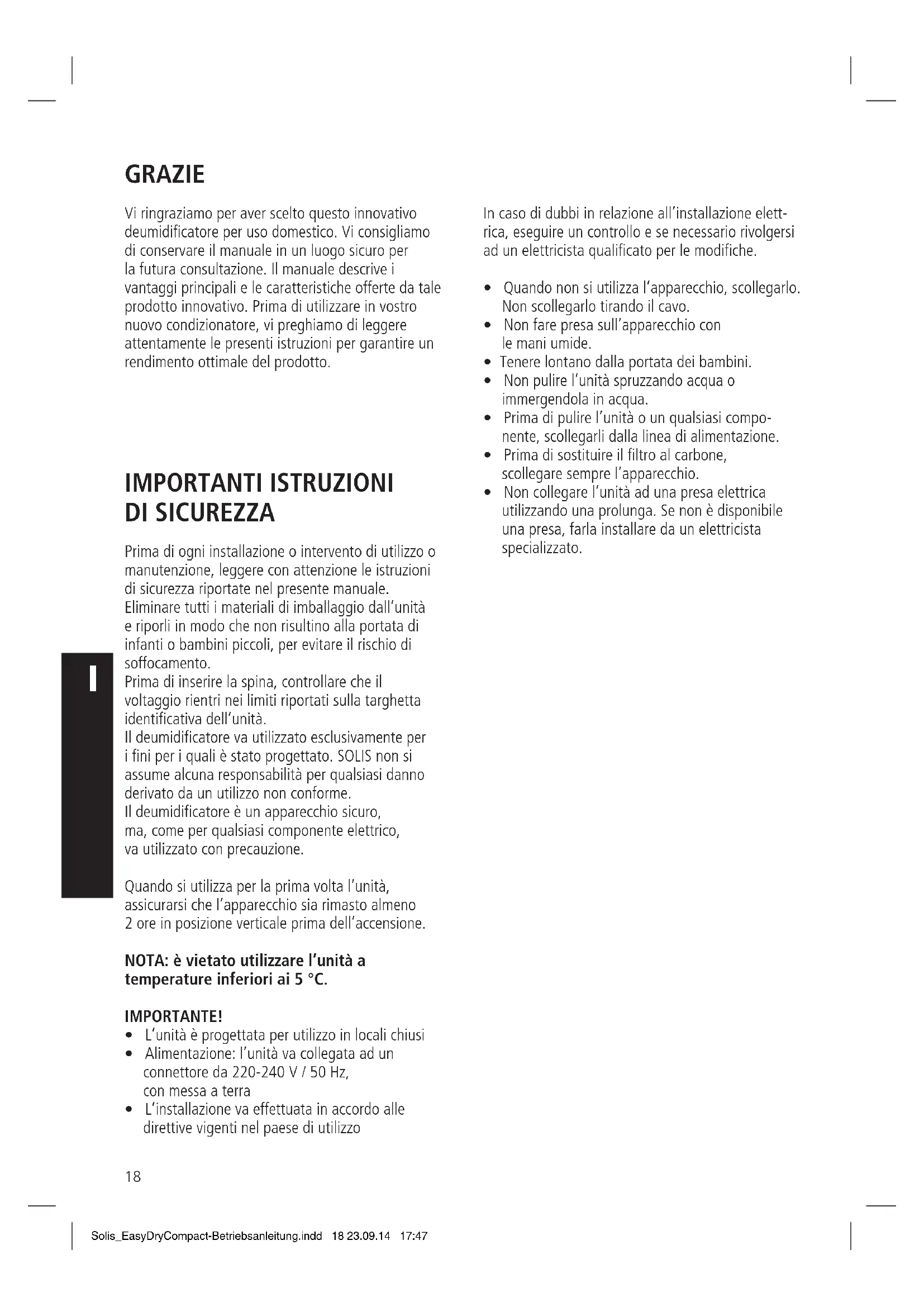- Non collegare l’unità ad una presa elettrica utilizzando una prolunga. Se non è disponibile una presa, farla installare da un elettricista specializzato. GRAZIE Solis_EasyDryCompact-Betriebsanleitung.indd 18 23.09.14 17:4719