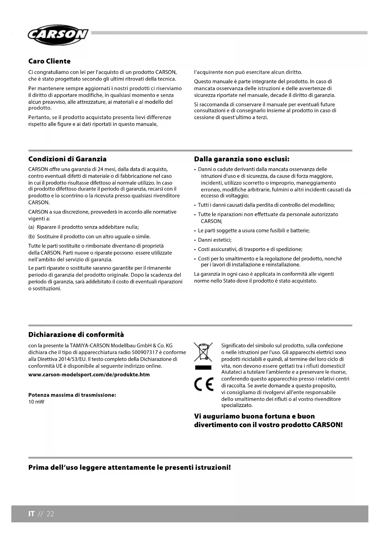 - Costi per lo smaltimento e la regolazione del prodotto, nonché per i lavori di installazione e reinstallazione. La garanzia in ogni caso è applicata in conformità alle vigenti norme nello Stato dove il prodotto è stato acquistato. Prima dell‘uso leggere attentamente le presenti istruzioni! con la presente la TAMIYA-CARSON Modellbau GmbH & Co. KG dichiara che il tipo di apparecchiatura radio 500907317 è conforme alla Direttiva 2014/53/EU. Il testo completo della Dichiarazione di conformità UE è disponibile al seguente indirizzo online. www.carson-modelsport.com/de/produkte.htm Potenza massima di trasmissione: 10 mW Significato del simbolo sul prodotto, sulla confezione o nelle istruzioni per l’uso. Gli apparecchi elettrici sono prodotti riciclabili e quindi, al termine del loro ciclo di vita, non devono essere gettati tra i rifiuti domestici! Aiutateci a tutelare l’ambiente e a preservare le risorse, conferendo questo apparecchio presso i relativi centri di raccolta. Se avete domande a questo proposito, vi consigliamo di rivolgervi all’ente responsabile dello smaltimento dei rifiuti o al vostro rivenditore specializzato. Vi auguriamo buona fortuna e buon divertimento con il vostro prodotto CARSON! Dichiarazione di conformità23 // IT