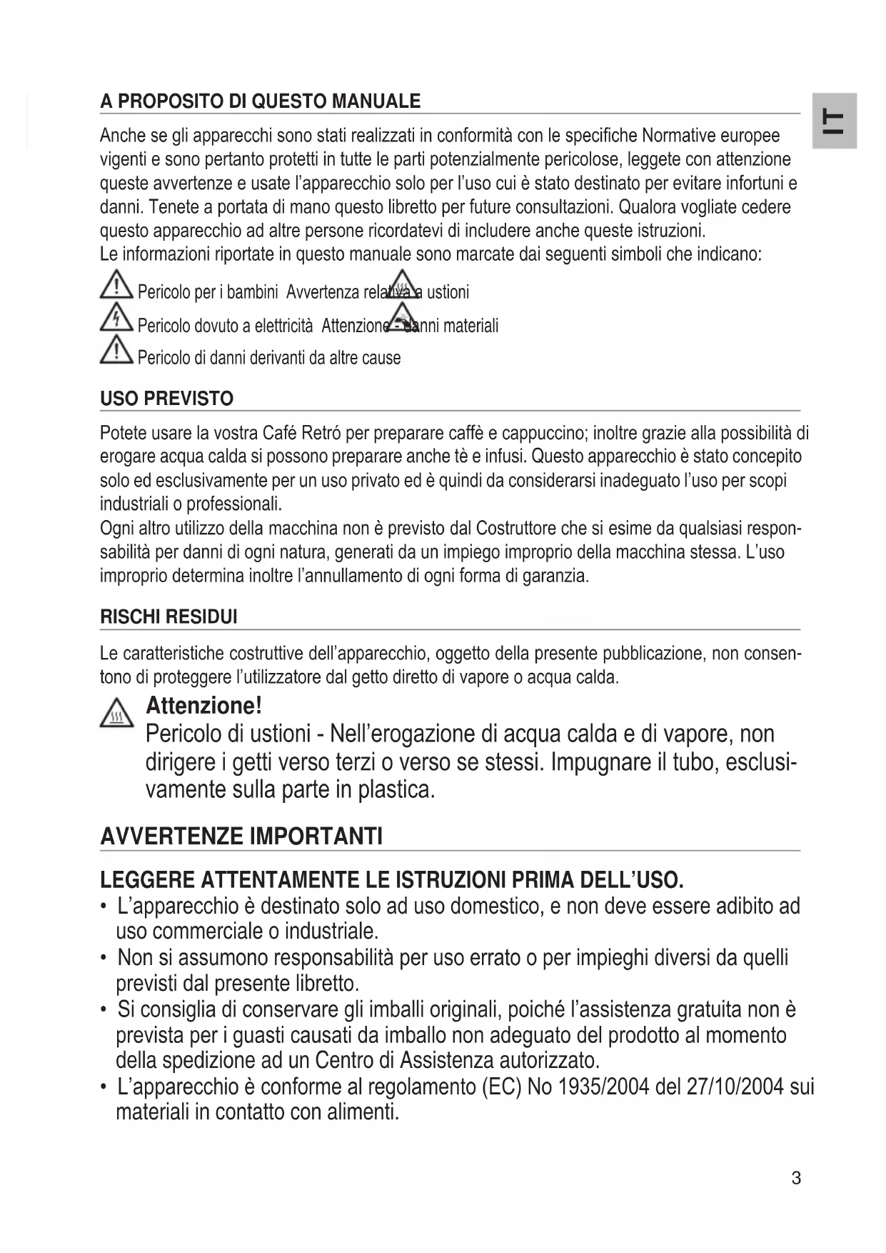 Anche se gli apparecchi sono stati realizzati in conformità con le speciche Normative europee vigenti e sono pertanto protetti in tutte le parti potenzialmente pericolose, leggete con attenzione queste avvertenze e usate l’apparecchio solo per l’uso cui è stato destinato per evitare infortuni e danni. Tenete a portata di mano questo libretto per future consultazioni. Qualora vogliate cedere questo apparecchio ad altre persone ricordatevi di includere anche queste istruzioni. Le informazioni riportate in questo manuale sono marcate dai seguenti simboli che indicano: Pericolo per i bambini Avvertenza relativa a ustioni Pericolo dovuto a elettricità Attenzione - danni materiali Pericolo di danni derivanti da altre cause USO PREVISTO Potete usare la vostra Café Retró per preparare caffè e cappuccino; inoltre grazie alla possibilità di erogare acqua calda si possono preparare anche tè e infusi. Questo apparecchio è stato concepito solo ed esclusivamente per un uso privato ed è quindi da considerarsi inadeguato l’uso per scopi industriali o professionali. Ogni altro utilizzo della macchina non è previsto dal Costruttore che si esime da qualsiasi respon- sabilità per danni di ogni natura, generati da un impiego improprio della macchina stessa. L’uso improprio determina inoltre l’annullamento di ogni forma di garanzia. RISCHI RESIDUI Le caratteristiche costruttive dell’apparecchio, oggetto della presente pubblicazione, non consen- tono di proteggere l’utilizzatore dal getto diretto di vapore o acqua calda. Attenzione! Pericolo di ustioni - Nell’erogazione di acqua calda e di vapore, non dirigere i getti verso terzi o verso se stessi. Impugnare il tubo, esclusi- vamente sulla parte in plastica. AVVERTENZE IMPORTANTI LEGGERE ATTENTAMENTE LE ISTRUZIONI PRIMA DELL’USO.