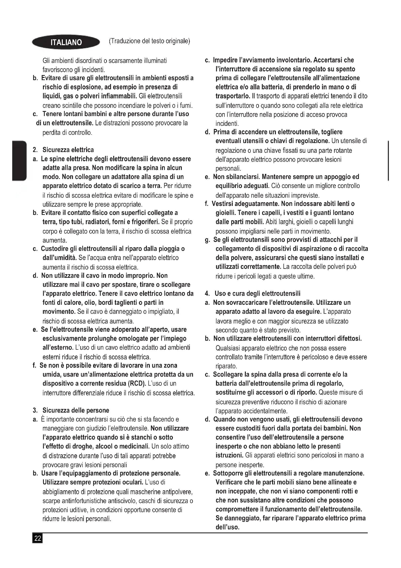 a. Mantenere pulita e bene illuminata l’area di lavoro.22 (Traduzione del testo originale) ITALIANO Gli ambienti disordinati o scarsamente illuminati favoriscono gli incidenti. b. Evitare di usare gli elettroutensili in ambienti esposti a rischio di esplosione, ad esempio in presenza di liquidi, gas o polveri infiammabili. Gli elettroutensili creano scintille che possono incendiare le polveri o i fumi. c. Tenere lontani bambini e altre persone durante l’uso di un elettroutensile. Le distrazioni possono provocare la perdita di controllo.