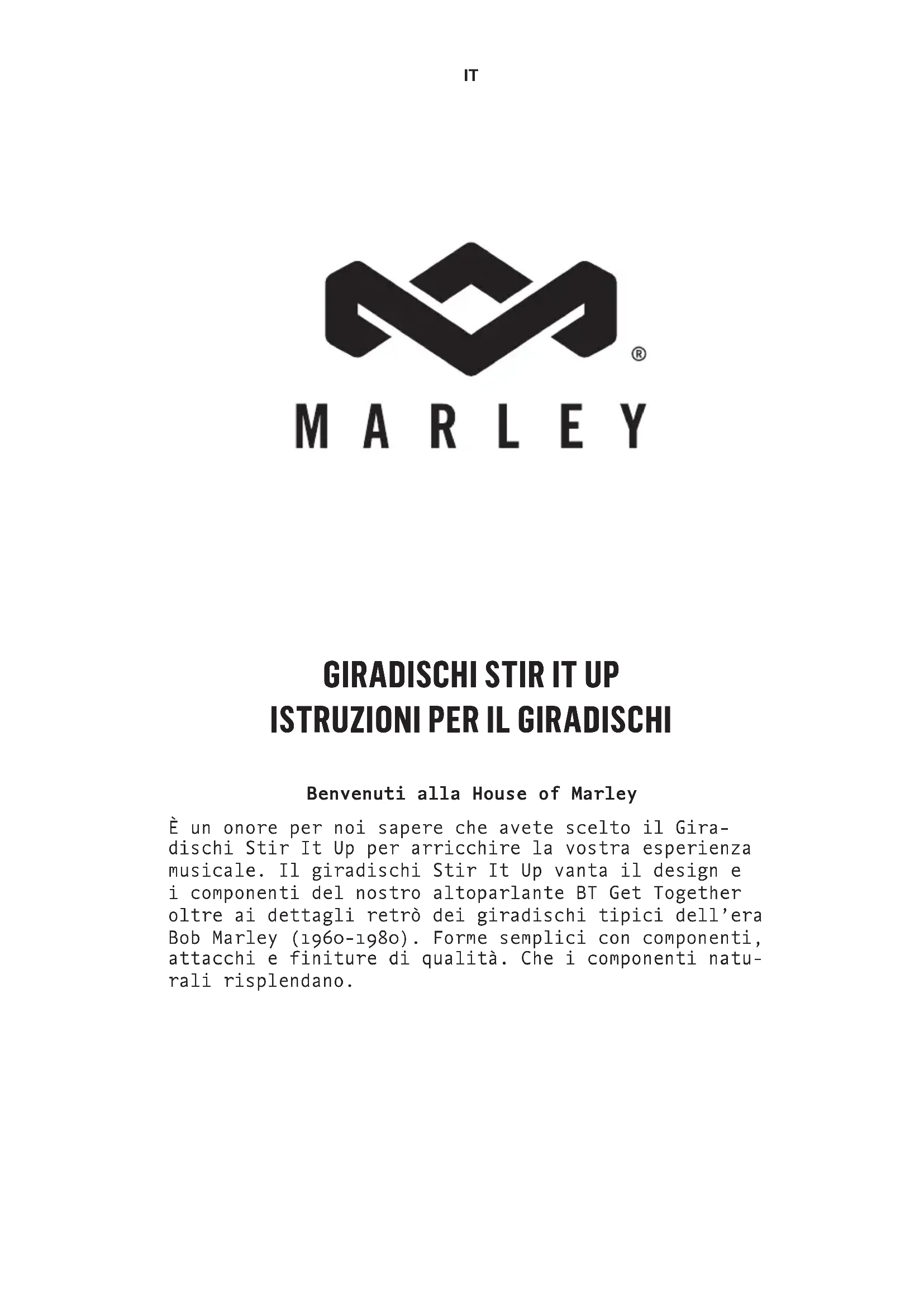 Benvenuti alla House of Marley È un onore per noi sapere che avete scelto il Gira- dischi Stir It Up per arricchire la vostra esperienza musicale. Il giradischi Stir It Up vanta il design e i componenti del nostro altoparlante BT Get Together oltre ai dettagli retrò dei giradischi tipici dell’era Bob Marley (1960-1980). Forme semplici con componenti, attacchi e finiture di qualità. Che i componenti natu- rali risplendano.