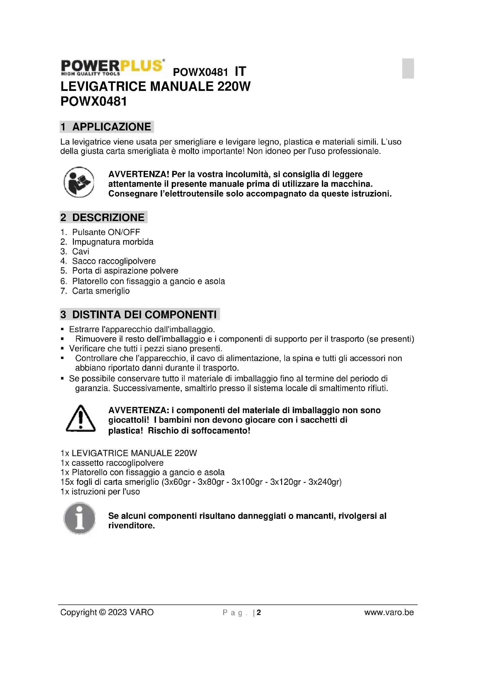 POWX0481 1 APPLICAZIONE La levigatrice viene usata per smerigliare e levigare legno, plastica e materiali simili. L’uso della giusta carta smerigliata è molto importante! Non idoneo per l'uso professionale. AVVERTENZA! Per la vostra incolumità, si consiglia di leggere attentamente il presente manuale prima di utilizzare la macchina. Consegnare l’elettroutensile solo accompagnato da queste istruzioni. 2 DESCRIZIONE