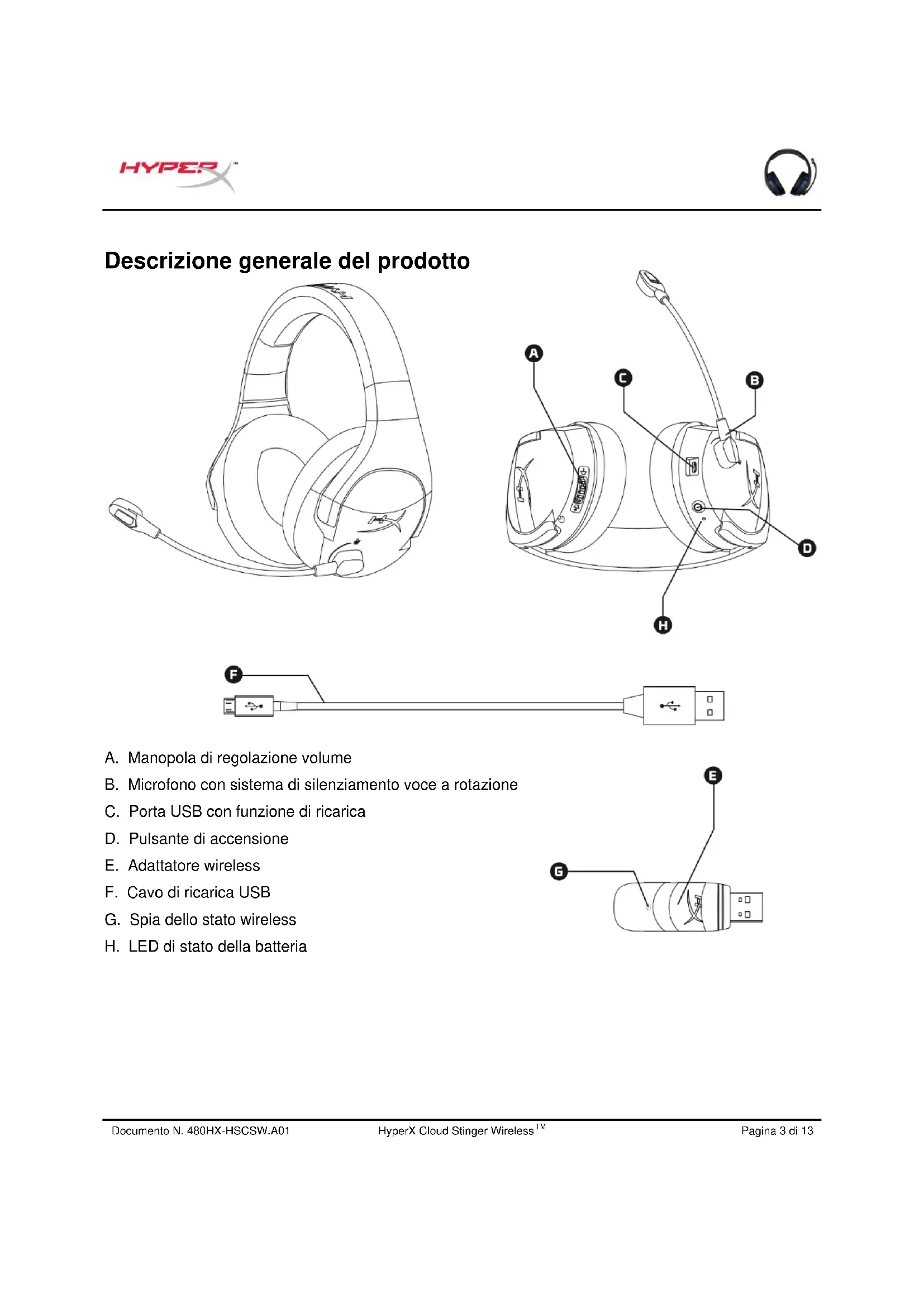 A. Manopola di regolazione volume B. Microfono con sistema di silenziamento voce a rotazione C. Porta USB con funzione di ricarica D. Pulsante di accensione E. Adattatore wireless F. Cavo di ricarica USB G. Spia dello stato wireless H. LED di stato della batteriaDocumento N. 480HX-HSCSW.A01 HyperX Cloud Stinger Wireless