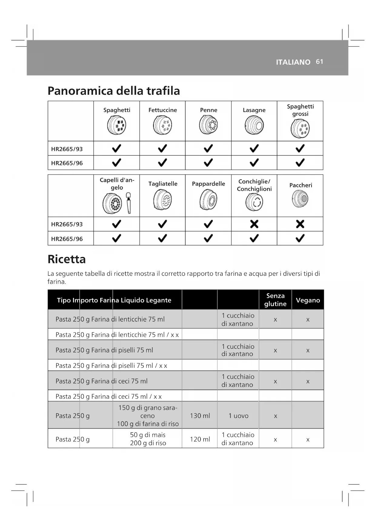 - Pasta/noodle alla barbabietola 4 Rimuovere il coperchio del vano per impastare. (Fig.3) 5 Attendere che 0:00 venga visualizzato sullo schermo. (Fig.18). 6 Versare la farina nel vano. (Fig.19) Nota y L'apparecchio pesa e visualizza automaticamente la quantità di farina. La misurazione del peso lampeggerà no a che non si raggiunge il giusto intervallo. (Fig.20) y Non versare nel vano meno di 200 g o più di 600 g di farina. y Alcune ricette (ad esempio i biscotti o la pasta senza glutine) richiedono di saltare la fase di pesatura. In questo caso, premere il pulsante di avvio/pausa per 5 secondi e l'apparecchio inizierà direttamente il processo di impasto ed estrusione della pasta. 7 Chiudere il coperchio del vano. (Fig.21) Nota y Se si preme un pulsante senza chiudere il coperchio, verrà visualizzato l'avviso di chiusura del vano. (Fig.22) y Inserire prima i due ganci nell'apparecchio, quindi premere il coperchio sull'unità principale. y L'apparecchio non si avvia se il coperchio del vano non è chiuso correttamente. Se durante il processo di preparazione, il coperchio del vano viene aperto, l'apparecchio smetterà di funzionare. Montare il coperchio e premere il pulsante di avvio/pausa per riavviare l'operazione. 8 Quando il coperchio è chiuso, viene visualizzata la quantità di liquido necessaria. (Fig.23)65 ITALIANO 9 Utilizzare il dosatore dell'acqua in dotazione per misurare la quantità di liquido richiesta dall'indicazione sul display. (Fig.24) Nota y Assicurarsi di misurare visivamente il volume dei liquidi su una supercie piana. y Quando si usa il composto con le uova, rompere le uova all'interno del dosatore dell'acqua. Aggiungere acqua no a raggiungere la quantità richiesta, quindi mescolare l'acqua e le uova per combinarle. y Se si preferisce, si possono usare 2 uova invece di 1, ma è importante accertarsi che la quantità complessiva di liquido suggerita non venga superata. y Per una maggiore precisione, utilizzare una bilancia da cucina per misurare il liquido. Avvio del programma per la preparazione della pasta 1 Premere il pulsante di avvio/pausa per iniziare a impastare e avviare il conto alla rovescia del tempo necessario. (Fig.25) 2 Una volta avviata la procedura di impasto, versare lentamente e in maniera uniforme il liquido nell'apertura del coperchio. (Fig.26) Nota: durante la fase di impasto, non aggiungere altri ingredienti dopo aver versato il liquido, per non compromettere la consistenza della pasta. 3 Quando la macchina per la pasta ha terminato l'impasto, emetterà un segnale acustico e, dopo alcuni secondi, la pasta inizierà a fuoriuscire. Utilizzare il tagliapasta per tagliare la pasta alla lunghezza desiderata. (Fig.27) Nota: se il rapporto tra liquido e farina non è corretto, la pasta non fuoriuscirà. Per altre ricette, consultare il capitolo "Ricetta". 4 Una volta completata la preparazione della pasta, se è presente un residuo di impasto all'interno del vano, premere prima il pulsante di sola fuoriuscita, quindi premere il pulsante di avvio/pausa per proseguire con questa operazione. (Fig.28) Nota: y L'ulteriore fuoriuscita ha una durata di 3 minuti. y Il tempo di cottura della pasta varia in base alle preferenze personali, al formato della pasta e al numero di porzioni. y Durante il processo di preparazione della pasta e al termine del processo, l'apparecchio emette un segnale acustico. Importante! Le ricette per la pasta fornite nel capitolo "Ricetta" sono state testate con successo. Se si desidera modicare queste ricette oppure utilizzarne altre, i dosaggi di farina e acqua/uova devono essere adattati. La macchina per la pasta non funzionerà correttamente se la nuova ricetta non viene adattata di conseguenza. Nota y Per risultati ottimali, è essenziale che l'impasto appaia friabile nel vano per la lavorazione. Se l'impasto è friabile, la ricetta avrà un esito positivo. Se l'impasto è troppo umido (consistenza dell'impasto classica) o troppo secco (impasto farinoso), l'esito della ricetta sarà negativo. y I cambi di stagione e l'utilizzo di ingredienti provenienti da zone diverse possono inuire sul dosaggio farina/acqua. Regolarsi sulla base delle proporzioni raccomandate.66 ITALIANO y Durante la preparazione di pasta senza glutine o pasta di legumi, è necessaria una quantità minore di liquido rispetto a quanto consigliato. Per queste ricette è possibile utilizzarne circa 10-20 ml di liquido in meno. Regolare la quantità di liquido in base al tipo di farina. y Il "glutine" è un legante che rende la pasta meno fragile. Le farine senza glutine non contengono alcun legante, per questo motivo un addensante è necessario per svolgere questa funzione, come ad esempio uova o xantano. I diversi tipi di farine senza glutine producono risultati dierenti nella preparazione della pasta. Alcune farine non sono adatte per la preparazione della pasta, come la farina di cocco; alcune funzionano bene, come la quinoa e il grano saraceno. y Per la preparazione della pasta all'uovo o della pasta vegetale, assicurarsi di mescolare il composto di uova o il succo vegetale con l'acqua in modo uniforme prima di versarlo nel vano attraverso l'apertura del coperchio. Aggiungere solo ingredienti in forma liquida. Pulizia 1 Scollegare la spina dalla presa di corrente. (Fig.29) 2 Rimuovere il coperchio del vano per impastare. (Fig.3) 3 Svitare le manopole del pannello anteriore. (Fig.4) Nota: il pannello anteriore è pesante; quindi, prestare particolare attenzione durante lo smontaggio. 4 Smontare nell'ordine: il pannello anteriore, la trala, il supporto dischi, la pala per mescolare e il vano per impastare. (Fig.5) 5 Usare un panno asciutto per pulire i residui di farina sull'unità principale. (Fig.30) 6 Pulire la trala con l'accessorio per la pulizia fornito in dotazione per rimuovere i residui di impasto. Dopodiché, lavarlo con acqua. (Fig.31) Nota: lasciare asciugare le trale per 2-4 ore, quindi, utilizzare l'accessorio per la pulizia corrispondente pe