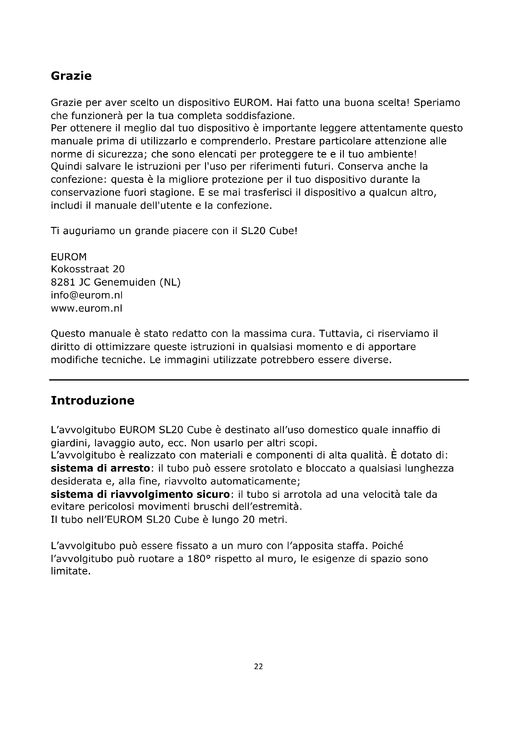 Introduzione L’avvolgitubo EUROM SL20 Cube è destinato all’uso domestico quale innaffio di giardini, lavaggio auto, ecc. Non usarlo per altri scopi. L’avvolgitubo è realizzato con materiali e componenti di alta qualità. È dotato di: sistema di arresto: il tubo può essere srotolato e bloccato a qualsiasi lunghezza desiderata e, alla fine, riavvolto automaticamente; sistema di riavvolgimento sicuro: il tubo si arrotola ad una velocità tale da evitare pericolosi movimenti bruschi dell’estremità. Il tubo nell’EUROM SL20 Cube è lungo 20 metri. L’avvolgitubo può essere fissato a un muro con l’apposita staffa. Poiché l’avvolgitubo può ruotare a 180° rispetto al muro, le esigenze di spazio sono limitate.23