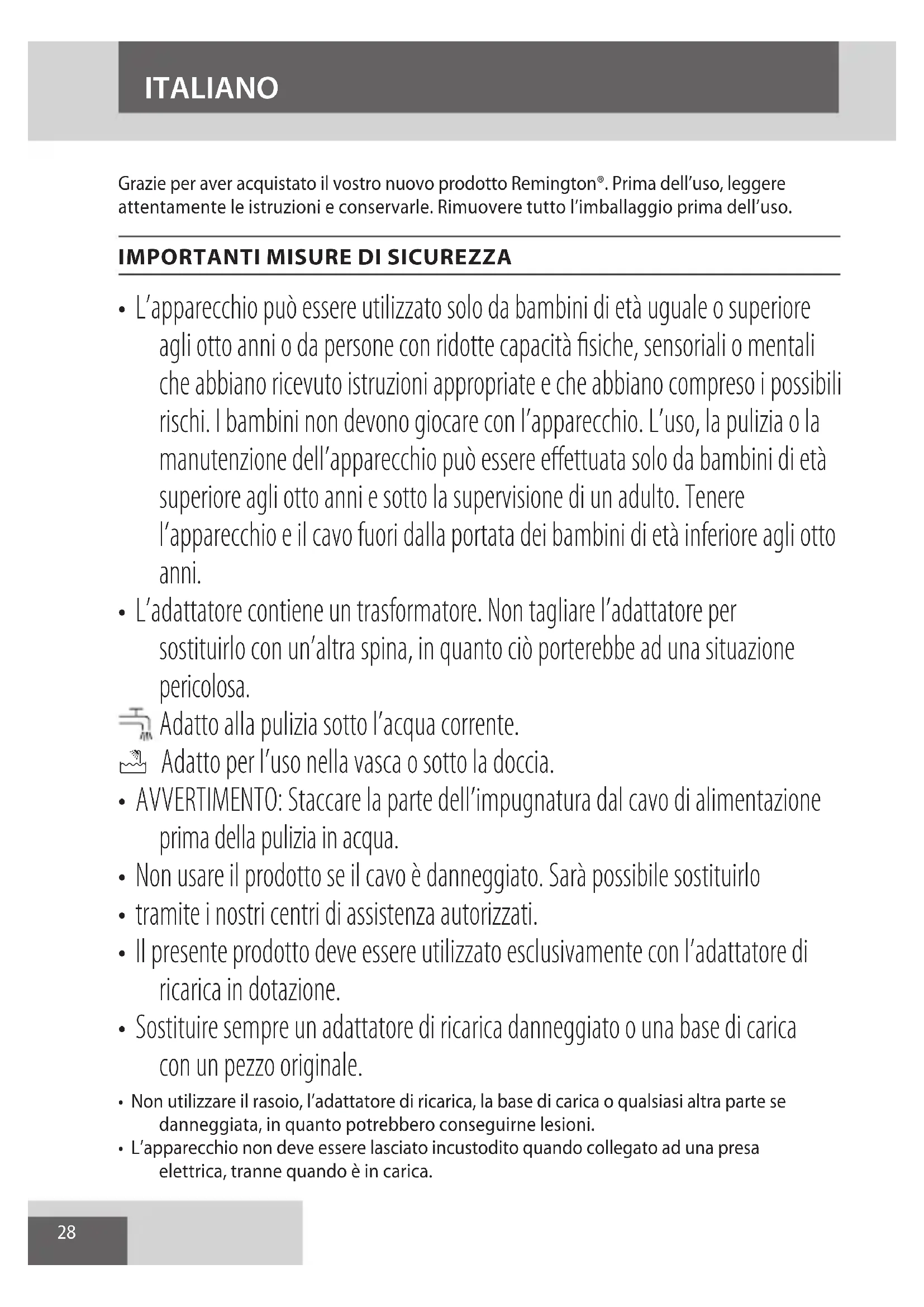 - L’apparecchio non deve essere lasciato incustodito quando collegato ad una presa elettrica, tranne quando è in carica. ITALIANO29 ITALIANO