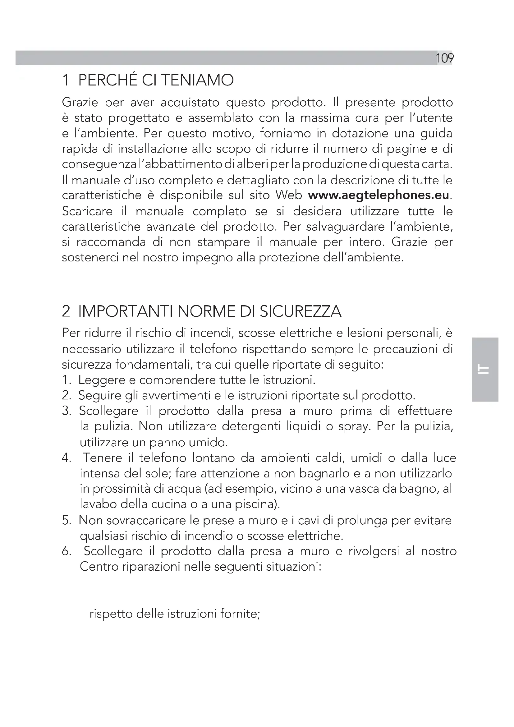 Grazie per aver acquistato questo prodotto. Il presente prodotto è stato progettato e assemblato con la massima cura per l‘utente e l‘ambiente. Per questo motivo, forniamo in dotazione una guida rapida di installazione allo scopo di ridurre il numero di pagine e di conseguenza l‘abbattimento di alberi per la produzione di questa carta. Il manuale d‘uso completo e dettagliato con la descrizione di tutte le caratteristiche è disponibile sul sito Web www.aegtelephones.eu. Scaricare il manuale completo se si desidera utilizzare tutte le caratteristiche avanzate del prodotto. Per salvaguardare l‘ambiente, si raccomanda di non stampare il manuale per intero. Grazie per sostenerci nel nostro impegno alla protezione dell‘ambiente.