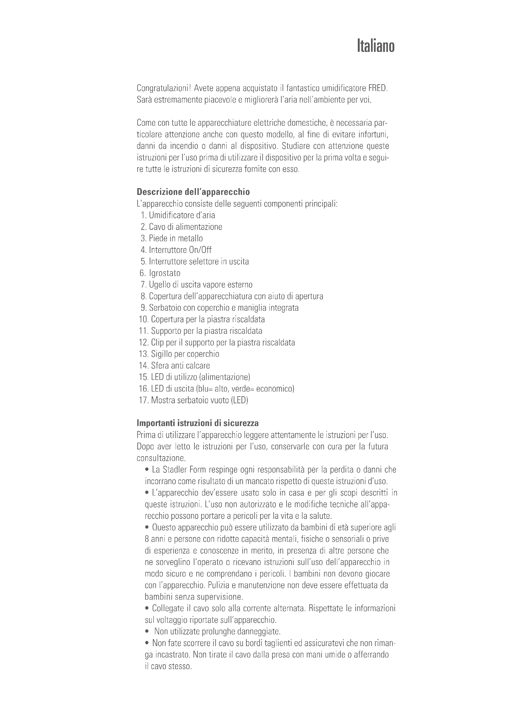 Scarica le istruzioni per il tuo Umidificatore in formato PDF gratuitamente! Trova il tuo manuale Fred - STADLER FORM e riprendi in mano il tuo dispositivo elettronico. In questa pagina sono pubblicati tutti i documenti necessari per l'utilizzo del tuo dispositivo. Fred del marchio STADLER FORM.