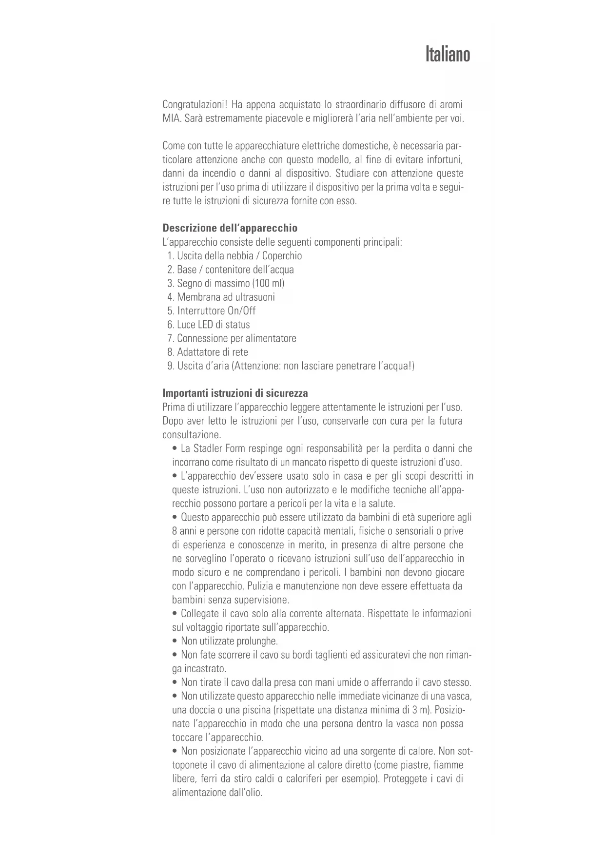 Scarica le istruzioni per il tuo Diffusore di aroma in formato PDF gratuitamente! Trova il tuo manuale Mia - STADLER FORM e riprendi in mano il tuo dispositivo elettronico. In questa pagina sono pubblicati tutti i documenti necessari per l'utilizzo del tuo dispositivo. Mia del marchio STADLER FORM.