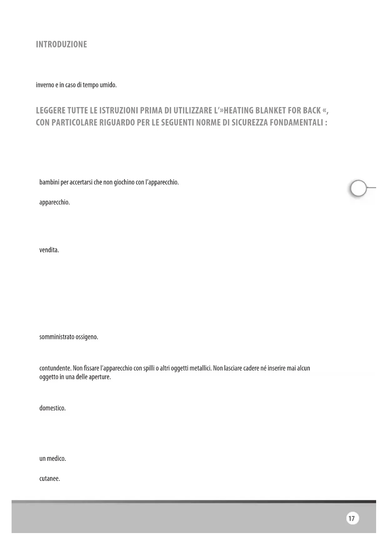 - Non utilizzare spille da balia, non grattare il gilet termico con un oggetto tagliente o non colpirlo con un oggetto contundente. Non fissare l’apparecchio con spilli o altri oggetti metallici. Non lasciare cadere né inserire mai alcun oggetto in una delle aperture.