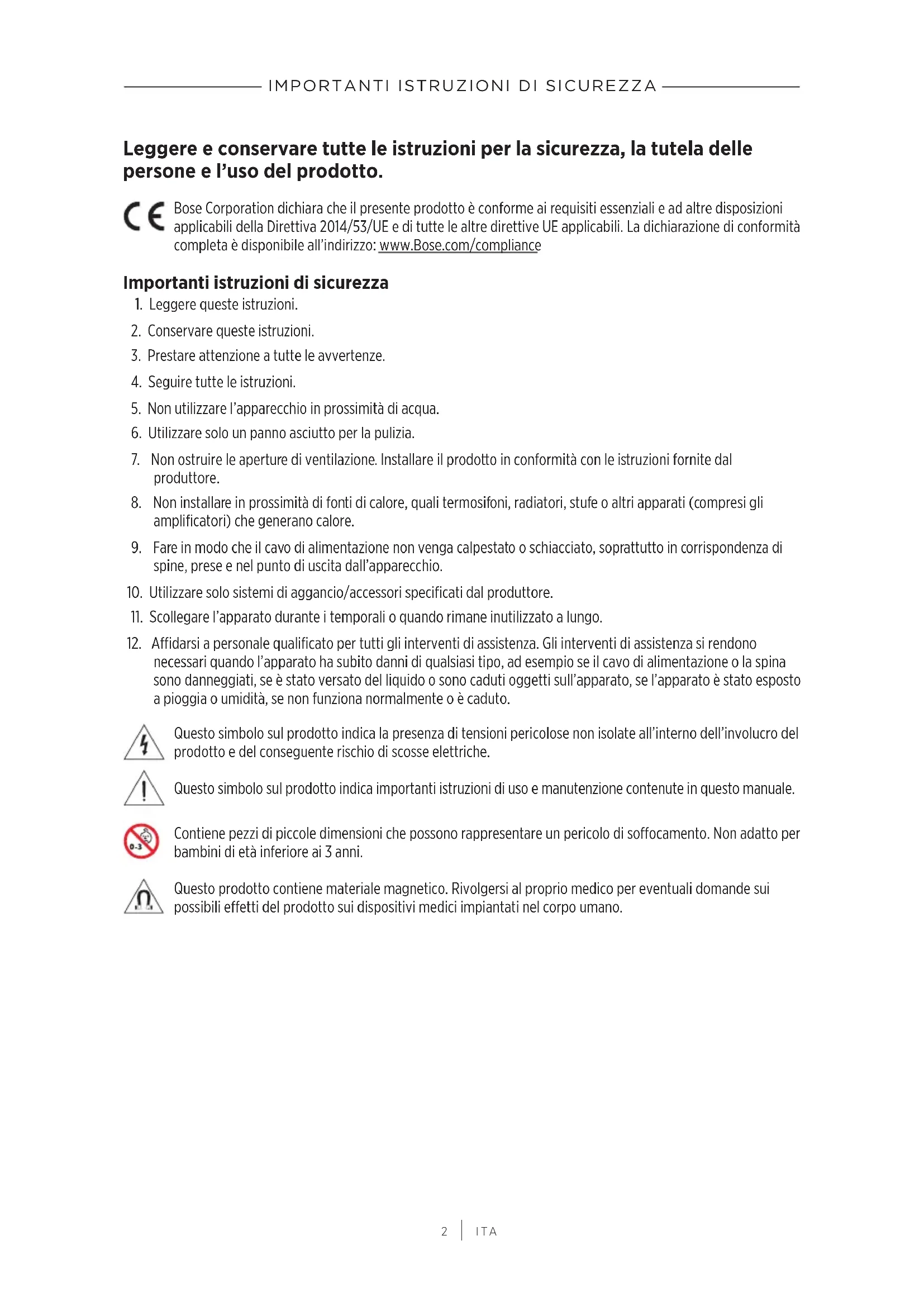 ITA Leggere e conservare tutte le istruzioni per la sicurezza, la tutela delle persone e l’uso del prodotto. Bose Corporation dichiara che il presente prodotto è conforme ai requisiti essenziali e ad altre disposizioni applicabili della Direttiva 2014/53/UE e di tutte le altre direttive UE applicabili. La dichiarazione di conformità completa è disponibile all’indirizzo: www.Bose.com/compliance Importanti istruzioni di sicurezza