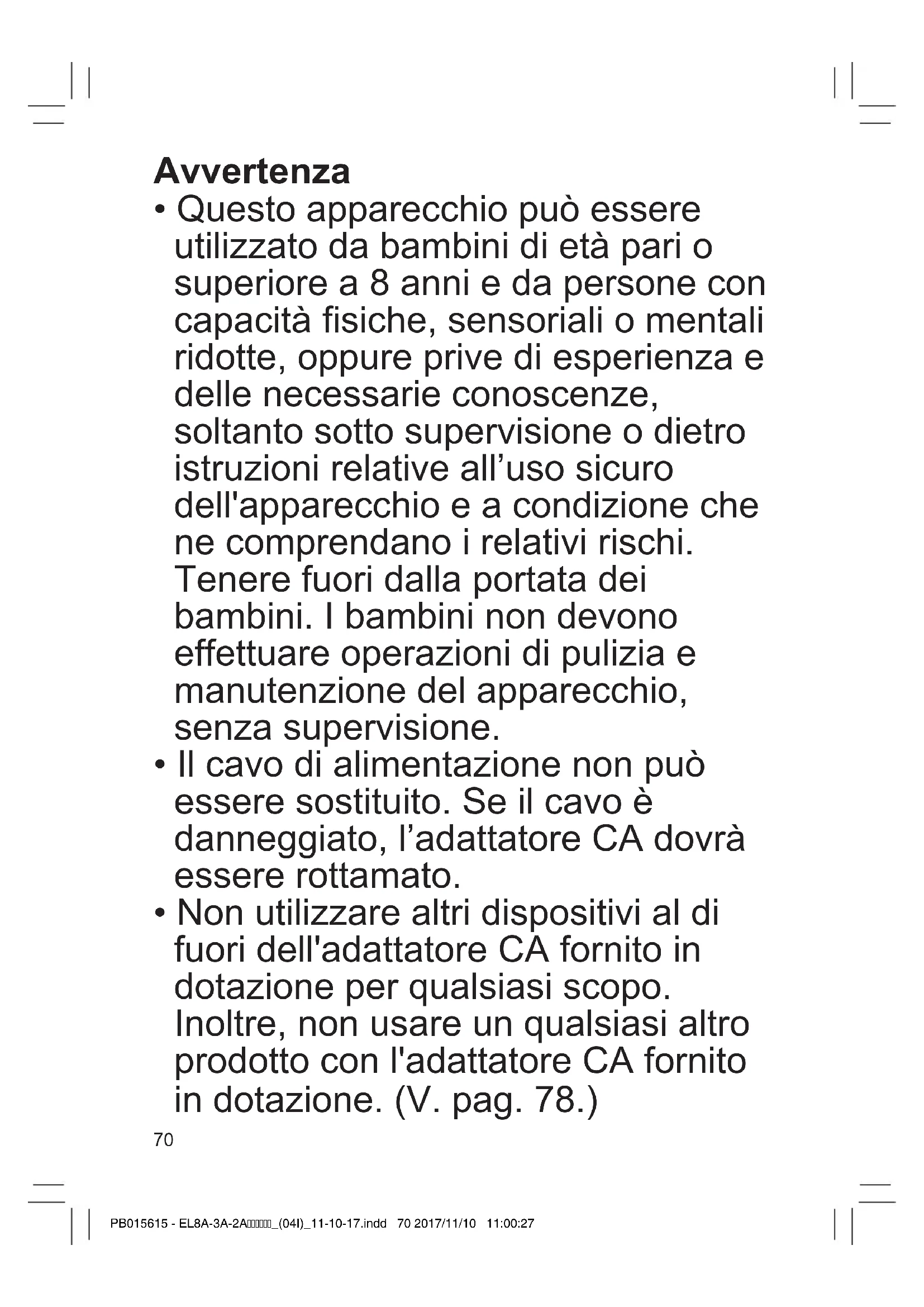 - Non utilizzare altri dispositivi al di fuoridell'adattatoreCAfornitoin dotazione per qualsiasi scopo. Inoltre,nonusareunqualsiasialtro prodottoconl'adattatoreCAfornito in dotazione. (V. pag. 78.) PB015615 - EL8A-3A-2A_(04I)_11-10-17.indd 70 2017/11/10 11:00:2771 GBDFINLEDKPNSFINPLCZSKHROTR