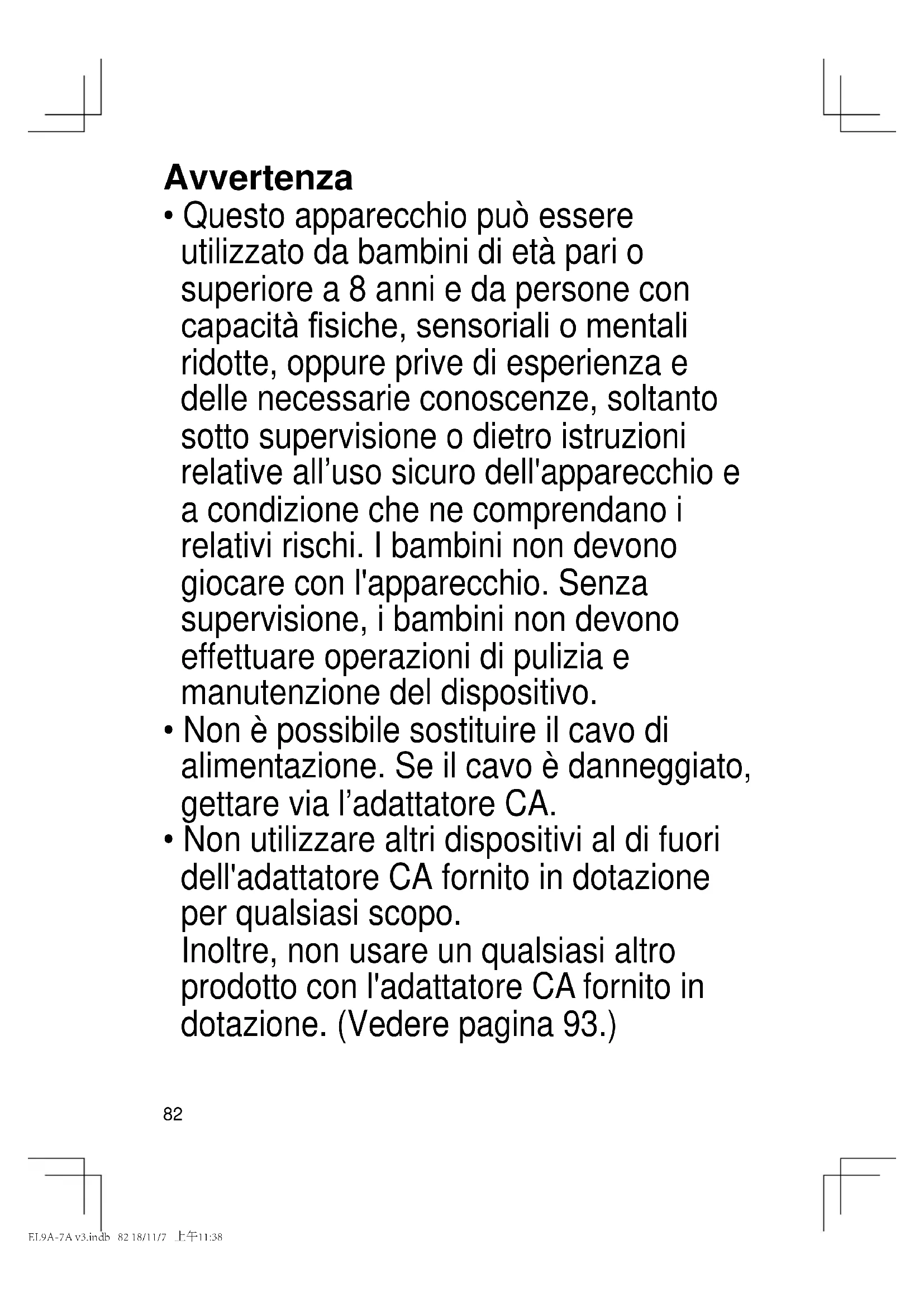 Farlo potrebbe provocare un capogiro. Non farlo cadere né sottoporlo a urti ‑ Farlo potrebbe provocare lesioni. Non avvolgere il cavo attorno all’adattatore o all’apparecchio quando si ripone quest’ultimo ‑ Farlo potrebbe rompere il lo all’interno del cavo e si potrebbero causare incendi dovuti a cortocircuiti. Scollegare la spina dell’adattatore o dell'apparecchio trattenendo la spina e non il cavo dell'adattatore o dell’apparecchio ‑ Scollegare tenedolo per il cavo potrebbe causare una scossa elettrica o lesioni. Scollegare l’adattatore dalla presa domestica quando l’apparecchio non è in carica ‑ Altrimenti si possono causare scosse elettriche o incendi a causa di dispersioni elettriche dovute al deterioramento dell’isolamento. EL9A-7A v3.indb 90 18/11/7 上午11:3891 GBDFINLEDKPNSFINPLCZSKHROTR AVVERTENZA Una volta rimossa la batteria ricaricabile, non tenerla a portata di mano di bambini e neonati ‑ Se ingerita accidentalmente, la batteria può arrecare danni alla persona. Se ciò avviene, consultare immediatamente un medico. Se il uido della batteria fuoriesce ed entra in contatto con gli occhi, non stronarli e sciacquare bene con acqua fresca come acqua corrente