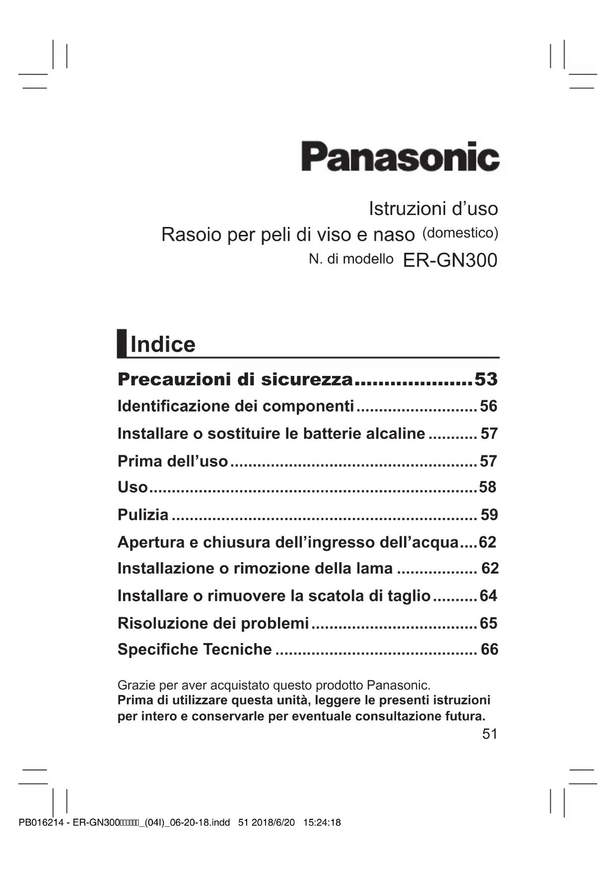 - Ruotare la lama esterna per allineare il segno“ ”alsegno“ ”delcorpoprincipale. PB016214 - ER-GN300_(04I)_06-20-18.indd 63 2018/6/20 15:24:2164 Installare o rimuovere il contenitore dei residui