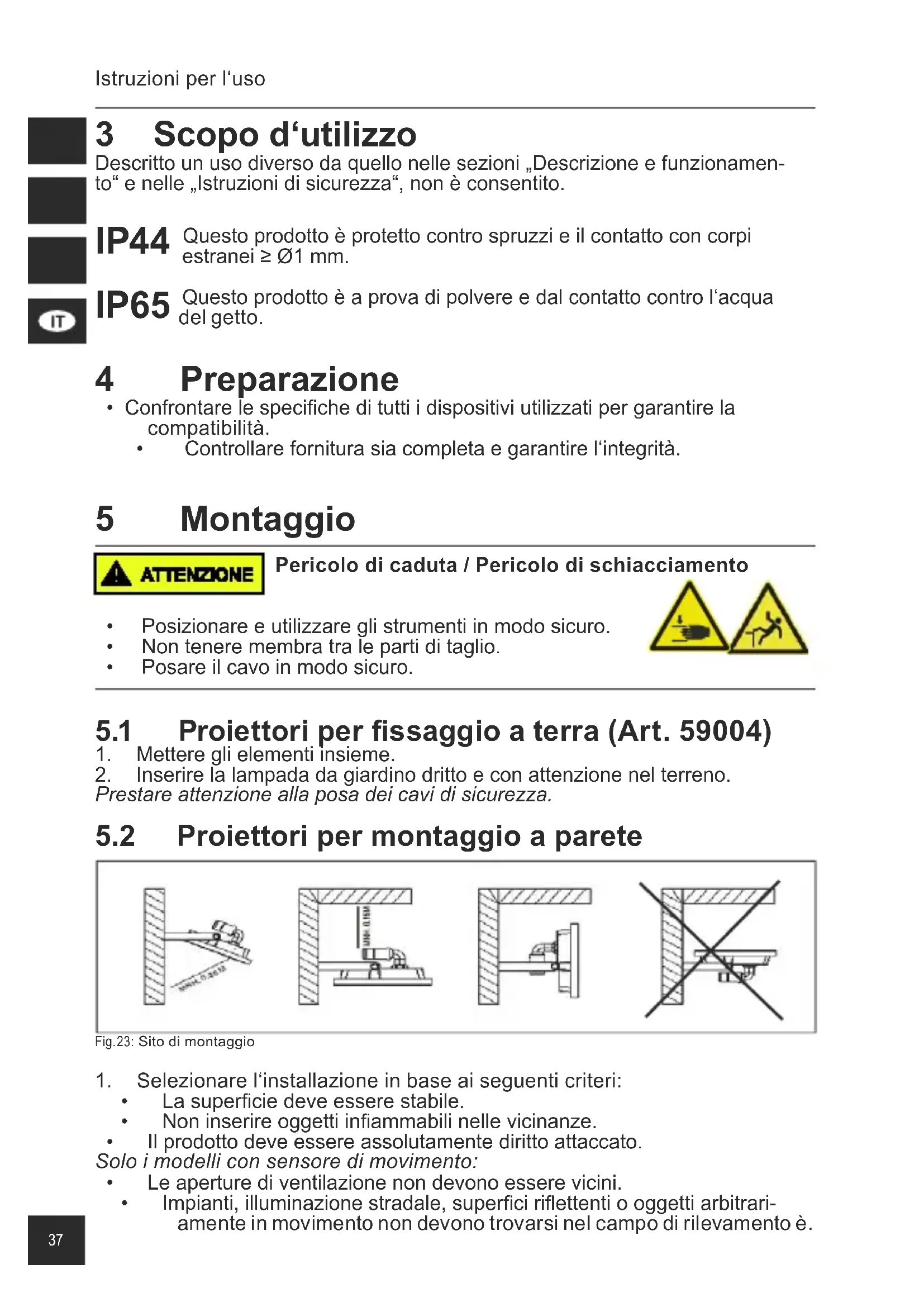 Peso (g) 380 580 980 1870 2540 3500 Flusso luminoso (lm ± 10) 830 1650 2500 1650 2500 3300 Protezione IP44 IP65 Angolo di rilevamento (°) 100 -Range (m) 10 Switch-o 10±5 s ~ 10±2 min. Collegamento Terminale Spina di sicurezza Altezza di installazione (m) 1.8-2.5 - Colore Ta b . 14 : Datitecnicispecici37 Istruzioni per l‘uso 3 Scopo d‘utilizzo Descritto un uso diverso da quello nelle sezioni „Descrizione e funzionamen- to“ e nelle „Istruzioni di sicurezza“, non è consentito. IP44 Questo prodotto è protetto contro spruzzi e il contatto con corpi estranei≥Ø1mm. IP65 Questo prodotto è a prova di polvere e dal contatto contro l‘acqua del getto. 4 Preparazione
