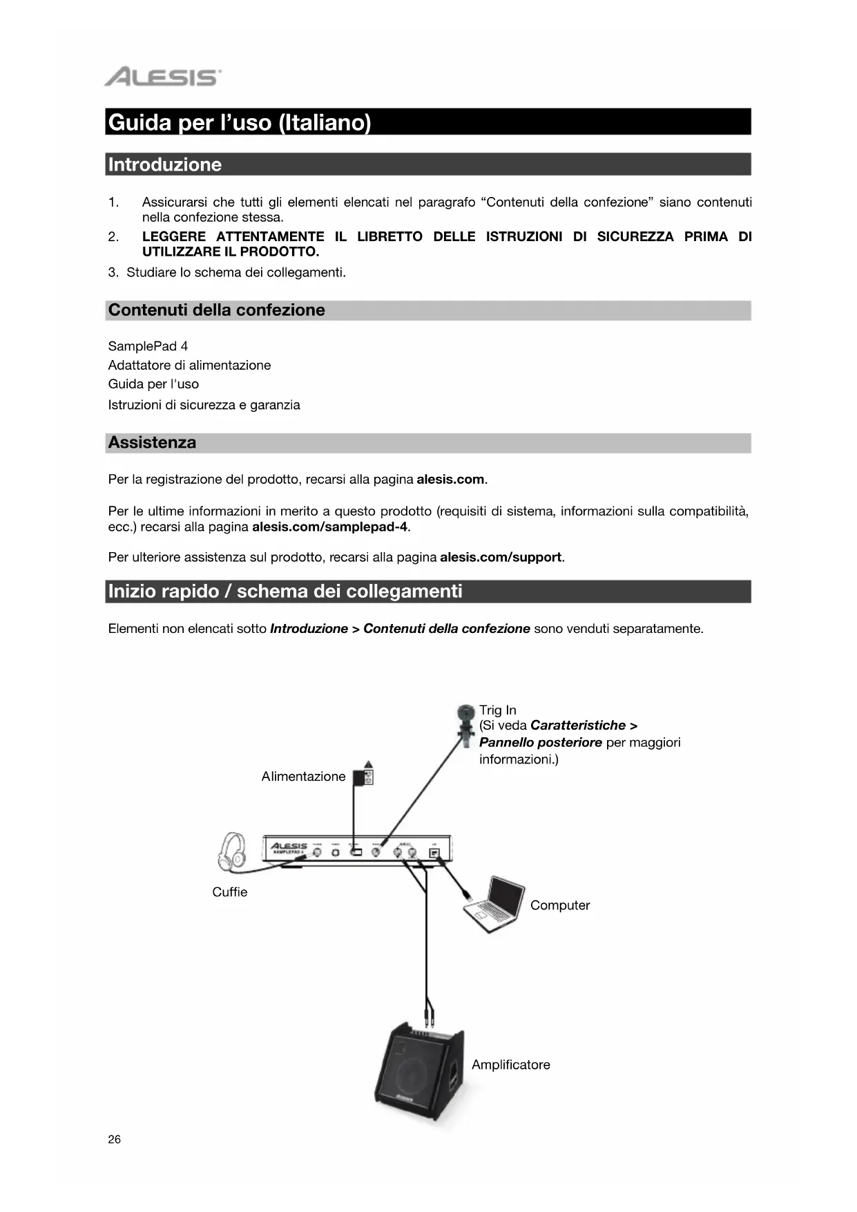 Contenuti della confezione SamplePad 4 Adattatore di alimentazione Guida per l'uso Istruzioni di sicurezza e garanzia Assistenza Per la registrazione del prodotto, recarsi alla pagina alesis.com. Per le ultime informazioni in merito a questo prodotto (requisiti di sistema, informazioni sulla compatibilità, ecc.) recarsi alla pagina alesis.com/samplepad-4. Per ulteriore assistenza sul prodotto, recarsi alla pagina alesis.com/support.