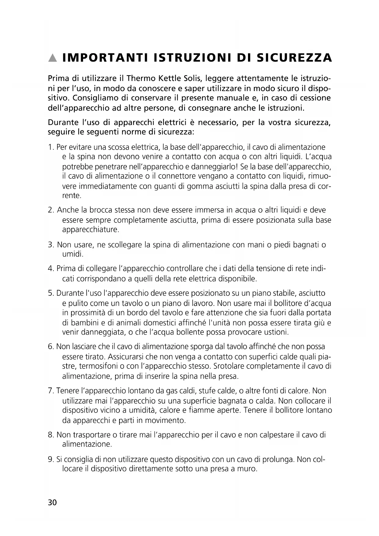 Prima di utilizzare il Thermo Kettle Solis, leggere attentamente le istruzio- ni per l’uso, in modo da conoscere e saper utilizzare in modo sicuro il dispo- sitivo. Consigliamo di conservare il presente manuale e, in caso di cessione dell’apparecchio ad altre persone, di consegnare anche le istruzioni. Durante l’uso di apparecchi elettrici è necessario, per la vostra sicurezza, seguire le seguenti norme di sicurezza: