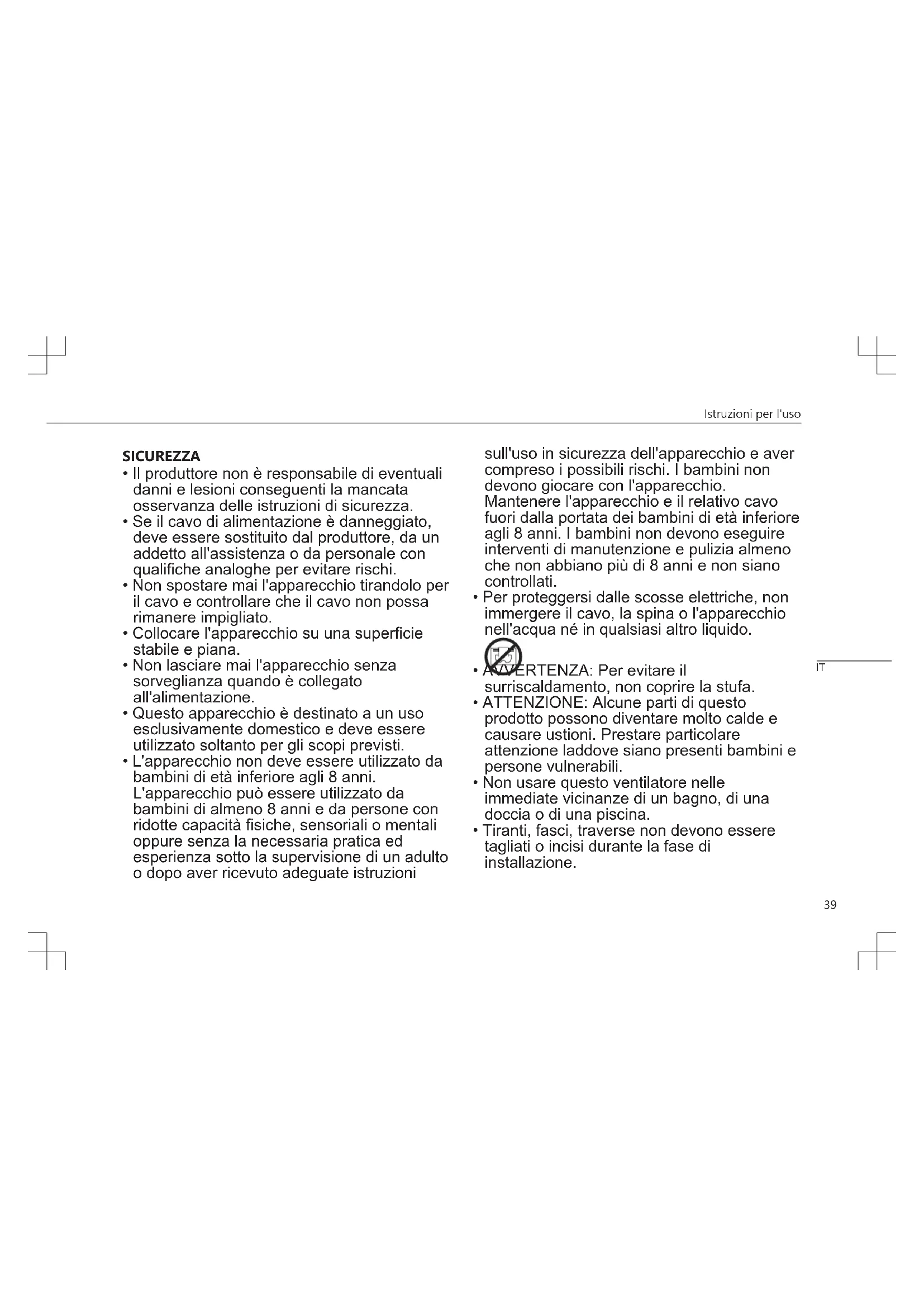 - Non usare questo ventilatore nelle immediate vicinanze di un bagno, di una doccia o di una piscina.