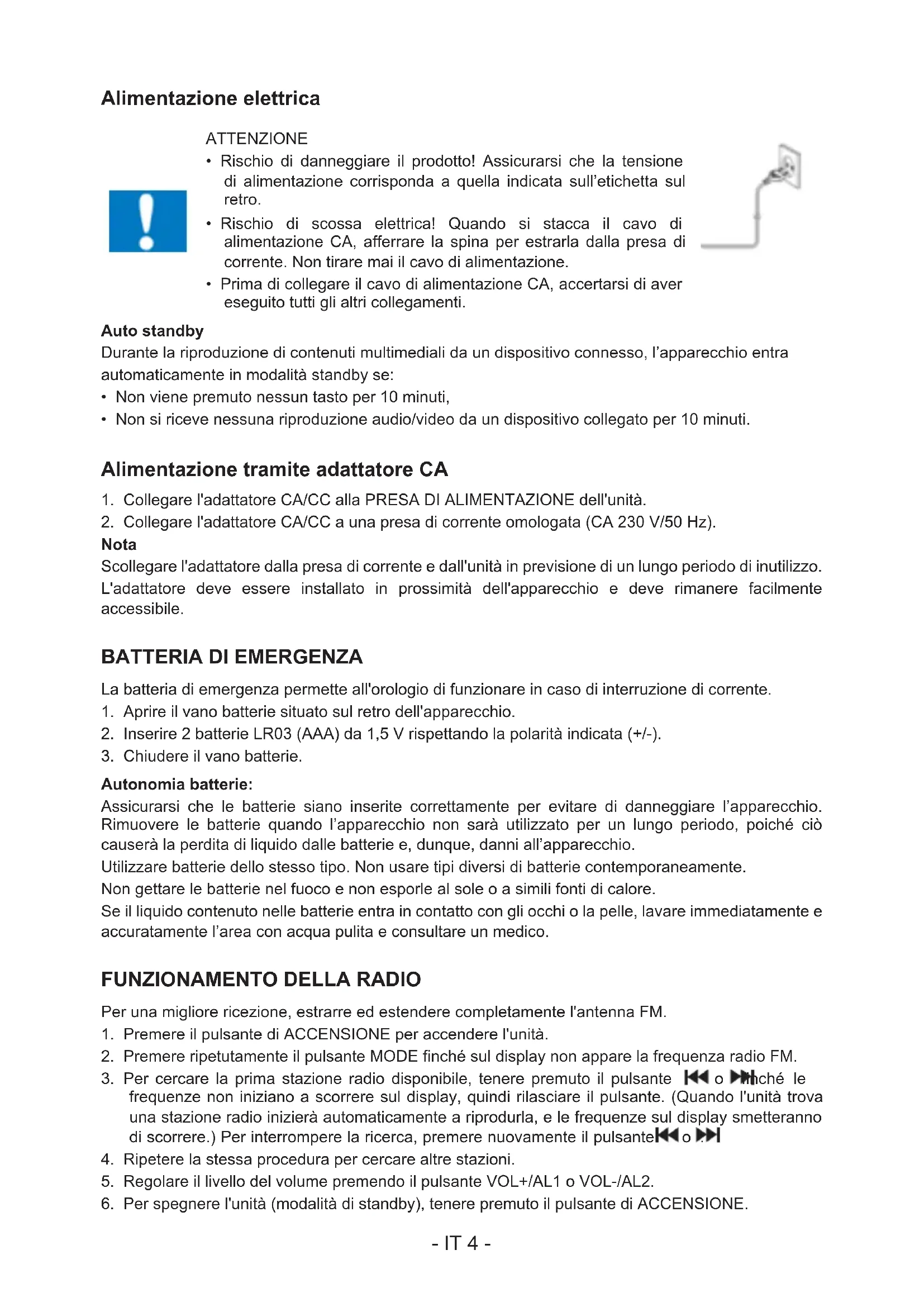 PRIMA DI UTILIZZARE L’APPARECCHIO, LEGGERE PER INTERO IL PRESENTE MANUALE E CONSERVARLO PER CONSULTAZIONI FUTURE. IT- IT 1 - Indice Per iniziare 1 Avvertenze di sicurezza ed altre informazioni Manutenzione del prodotto 2 Protezione dell’ambiente Contenuto della confezione 3 Descrizione delle parti Alimentazione elettrica 4 Alimentazione tramite adattatore ca Batteria di emergenza Funzionamento della radio Ascoltare le stazioni memorizzate 5 Impostare l'orologio Impostare la sveglia Posticipo della sveglia 6 Spegnere la sveglia Spegnimento automatico Luce Ascoltare musica via usb Funzione di ricarica 7 Retroilluminazione Proiezione dell'orologio Controllo del volume Ingresso ausiliario Presa per cufe Avvertenza rischio di danni all’udito Nota 8 Per iniziare