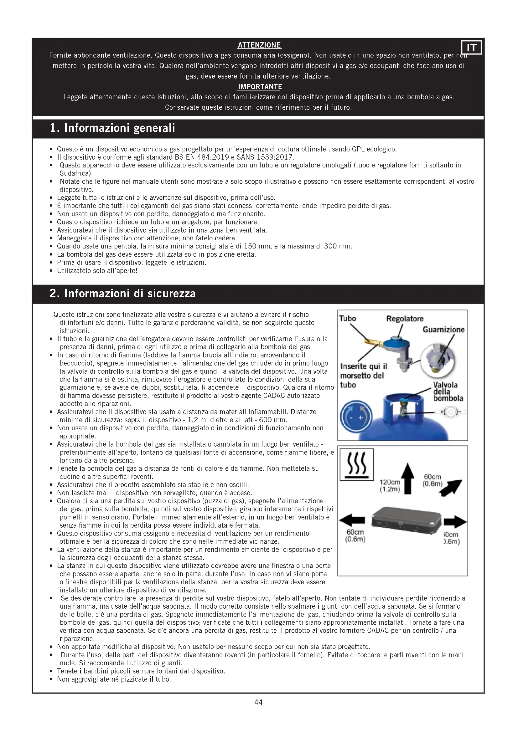 - Qualora ci sia una perdita sul vostro dispositivo (puzza di gas), spegnete l’alimentazione del gas, prima sulla bombola, quindi sul vostro dispositivo, girando interamente i rispettivi pomelli in senso orario. Portateli immediatamente all’esterno, in un luogo ben ventilato e senza amme in cui la perdita possa essere individuata e fermata.