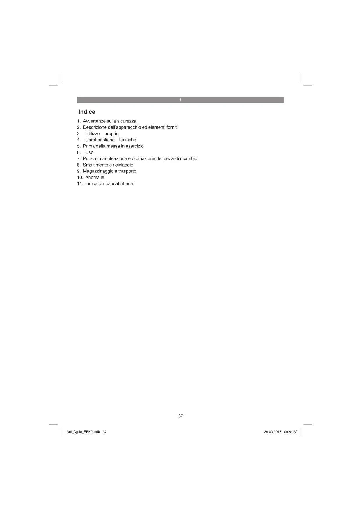 L‘apparecchio non funziona Controllate che la batteria sia carica e che il cari- cabatterie funzioni. Nel caso in cui l‘apparecchio non funzioni pur in presenza di tensione, spedi- telo all‘indirizzo dell‘assistenza clienti indicato. Anl_Agillo_SPK2.indb 46Anl_Agillo_SPK2.indb 46 29.03.2018 09:54:3329.03.2018 09:54:33I