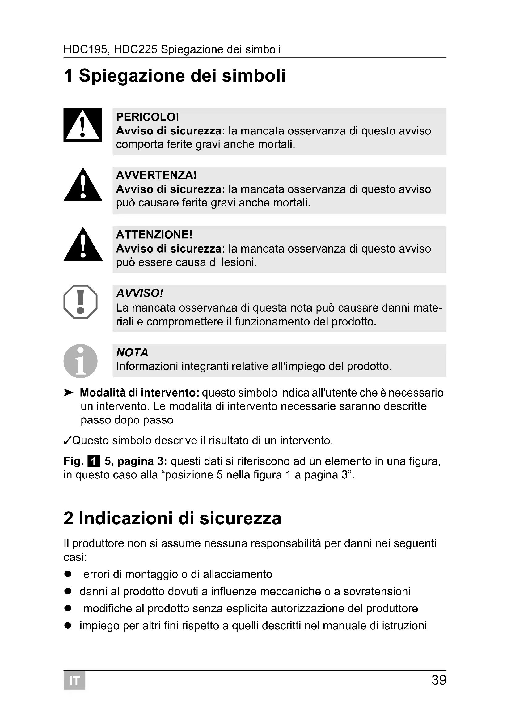 ➤ Modalità di intervento: questo simbolo indica all'utente che è necessario un intervento. Le modalità di intervento necessarie saranno descritte passo dopo passo. ✓ Questo simbolo descrive il risultato di un intervento. Fig. 1 5, pagina 3: questi dati si riferiscono ad un elemento in una figura, in questo caso alla “posizione 5 nella figura 1 a pagina 3”. 2 Indicazioni di sicurezza Il produttore non si assume nessuna responsabilità per danni nei seguenti casi: errori di montaggio o di allacciamento danni al prodotto dovuti a influenze meccaniche o a sovratensioni modifiche al prodotto senza esplicita autorizzazione del produttore impiego per altri fini rispetto a quelli descritti nel manuale di istruzioni PERICOLO! Avviso di sicurezza: la mancata osservanza di questo avviso comporta ferite gravi anche mortali. AVVERTENZA! Avviso di sicurezza: la mancata osservanza di questo avviso può causare ferite gravi anche mortali. ATTENZIONE! Avviso di sicurezza: la mancata osservanza di questo avviso può essere causa di lesioni. AVVISO! La mancata osservanza di questa nota può causare danni mate- riali e compromettere il funzionamento del prodotto. NOTA Informazioni integranti relative all'impiego del prodotto.IT Indicazioni di sicurezza HDC195, HDC225