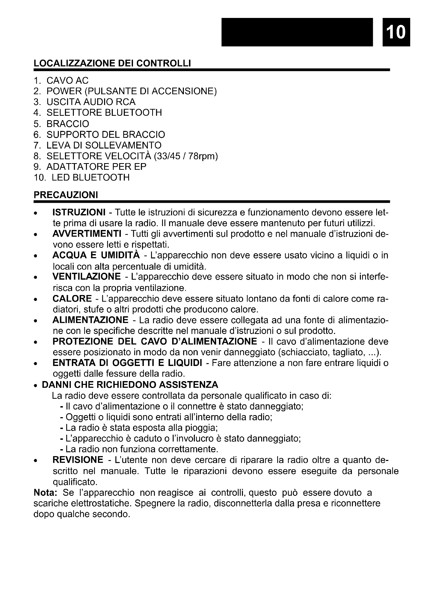 La radio deve essere controllata da personale qualificato in caso di: - Il cavo d’alimentazione o il connettre è stato danneggiato; - Oggetti o liquidi sono entrati all’interno della radio; - La radio è stata esposta alla pioggia; - L’apparecchio è caduto o l’involucro è stato danneggiato; - La radio non funziona correttamente. REVISIONE - L’utente non deve cercare di riparare la radio oltre a quanto de- scritto nel manuale. Tutte le riparazioni devono essere eseguite da personale qualificato. Nota: Se l’apparecchio non reagisce ai controlli, questo può essere dovuto a scariche elettrostatiche. Spegnere la radio, disconnetterla dalla presa e riconnettere dopo qualche secondo.11 Italiano