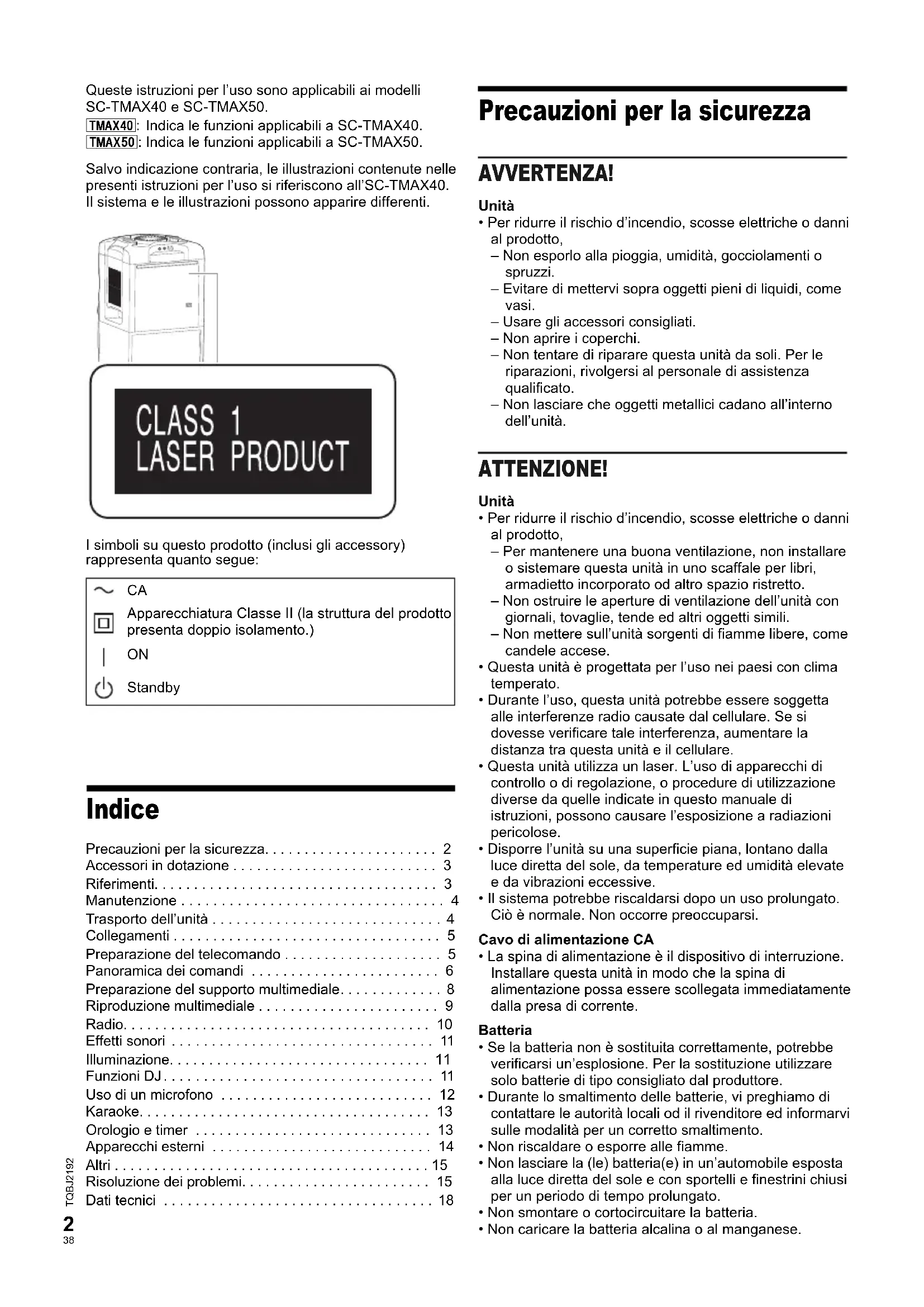 - Dati tecnici Precauzioni per la sicurezza AVVERTENZA! Unità• Per ridurre il rischio d’incendio, scosse elettriche o danni al prodotto,– Non esporlo alla pioggia, umidità, gocciolamenti o spruzzi.– Evitare di mettervi sopra oggetti pieni di liquidi, come vasi.– Usare gli accessori consigliati.– Non aprire i coperchi.– Non tentare di riparare questa unità da soli. Per le riparazioni, rivolgersi al personale di assistenza qualificato.– Non lasciare che oggetti metallici cadano all’interno dell’unità. ATTENZIONE! Unità• Per ridurre il rischio d’incendio, scosse elettriche o danni al prodotto,– Per mantenere una buona ventilazione, non installare o sistemare questa unità in uno scaffale per libri, armadietto incorporato od altro spazio ristretto.– Non ostruire le aperture di ventilazione dell’unità con giornali, tovaglie, tende ed altri oggetti simili.– Non mettere sull’unità sorgenti di fiamme libere, come candele accese.• Questa unità è progettata per l’uso nei paesi con clima temperato.• Durante l’uso, questa unità potrebbe essere soggetta alle interferenze radio causate dal cellulare. Se si dovesse verificare tale interferenza, aumentare la distanza tra questa unità e il cellulare.• Questa unità utilizza un laser. L’uso di apparecchi di controllo o di regolazione, o procedure di utilizzazione diverse da quelle indicate in questo manuale di istruzioni, possono causare l’esposizione a radiazioni pericolose. • Disporre l’unità su una superficie piana, lontano dalla luce diretta del sole, da temperature ed umidità elevate e da vibrazioni eccessive.• Il sistema potrebbe riscaldarsi dopo un uso prolungato. Ciò è normale. Non occorre preoccuparsi.Cavo di alimentazione CA• La spina di alimentazione è il dispositivo di interruzione. Installare questa unità in modo che la spina di alimentazione possa essere scollegata immediatamente dalla presa di corrente.Batteria• Se la batteria non è sostituita correttamente, potrebbe verificarsi un’esplosione. Per la sostituzione utilizzare solo batterie di tipo consigliato dal produttore.• Durante lo smaltimento delle batterie, vi preghiamo di contattare le autorità locali od il rivenditore ed informarvi sulle modalità per un corretto smaltimento.• Non riscaldare o esporre alle fiamme.• Non lasciare la (le) batteria(e) in un’automobile esposta alla luce diretta del sole e con sportelli e finestrini chiusi per un periodo di tempo prolungato.• Non smontare o cortocircuitare la batteria.• Non caricare la batteria alcalina o al manganese.[TMAX40]:[TMAX50]:Indica le funzioni applicabili a SC-TMAX40.Indica le funzioni applicabili a SC-TMAX50. Apparecchiatura Classe II (la struttura del prodotto presenta doppio isolamento.) Standby TMAX40.50E_TQBJ2192_Ge.Fr.It.Du.Sp.book Page 2 Wednesday, July 3, 2019 1:45 PM offset printingConfidential Until: 02 Aug 2019 p. 18
