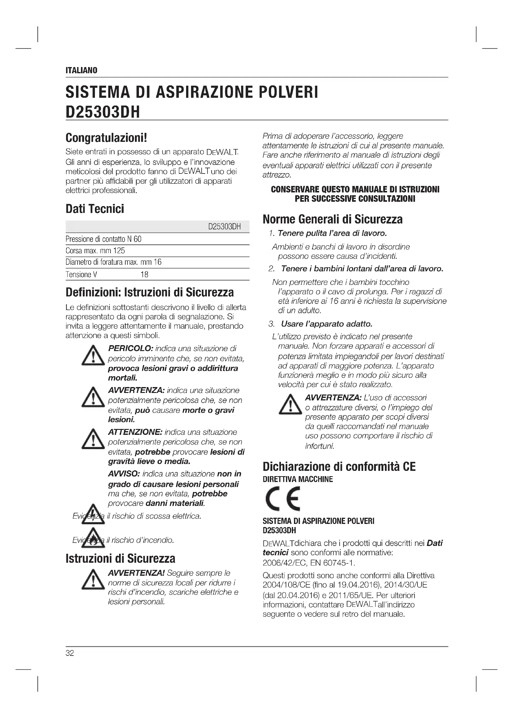Scarica le istruzioni per il tuo Aspirapolvere in formato PDF gratuitamente! Trova il tuo manuale D25303DH - DEWALT e riprendi in mano il tuo dispositivo elettronico. In questa pagina sono pubblicati tutti i documenti necessari per l'utilizzo del tuo dispositivo. D25303DH del marchio DEWALT.