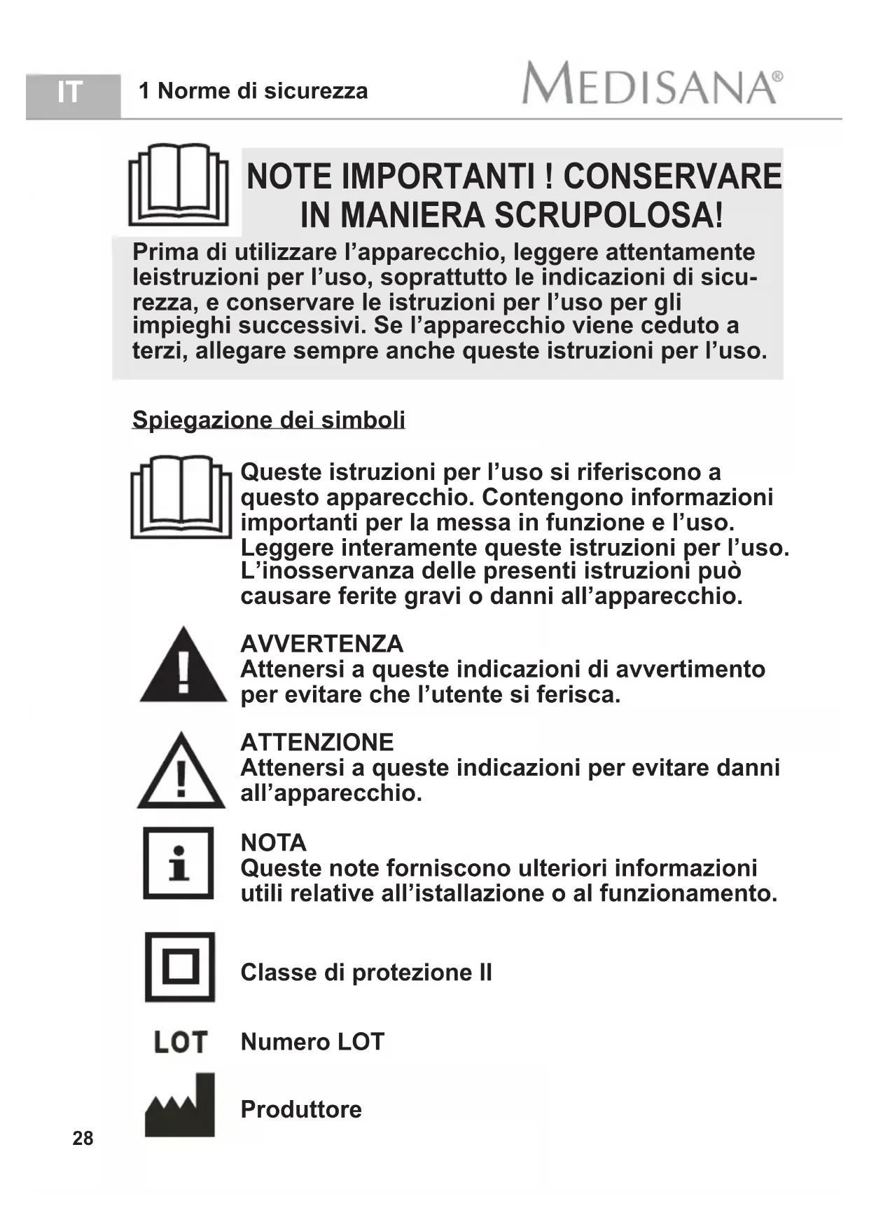 Queste istruzioni per l’uso si riferiscono a questo apparecchio. Contengono informazioni importanti per la messa in funzione e l’uso. Leggere interamente queste istruzioni per l’uso. L’inosservanza delle presenti istruzioni può causare ferite gravi o danni all’apparecchio. AVVERTENZA Attenersi a queste indicazioni di avvertimento per evitare che l’utente si ferisca. ATTENZIONE Attenersi a queste indicazioni per evitare danni all’apparecchio. NOTA Queste note forniscono ulteriori informazioni utili relative all’istallazione o al funzionamento. Numero LOT Produttore Classe di protezione IIIT 1 Norme di sicurezza