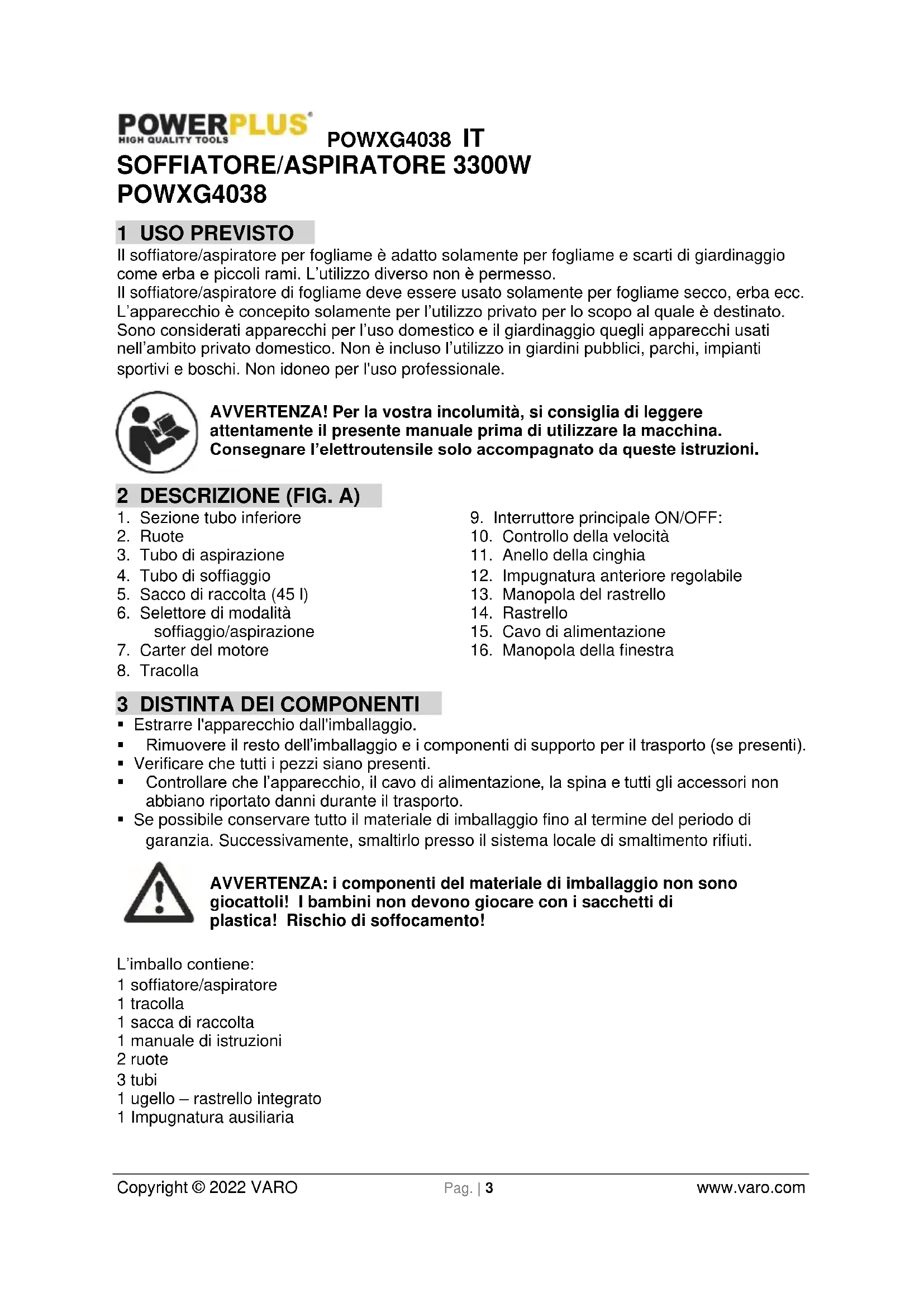 Scarica le istruzioni per il tuo Soffiatore in formato PDF gratuitamente! Trova il tuo manuale POWXG4038 - PowerPlus e riprendi in mano il tuo dispositivo elettronico. In questa pagina sono pubblicati tutti i documenti necessari per l'utilizzo del tuo dispositivo. POWXG4038 del marchio PowerPlus.