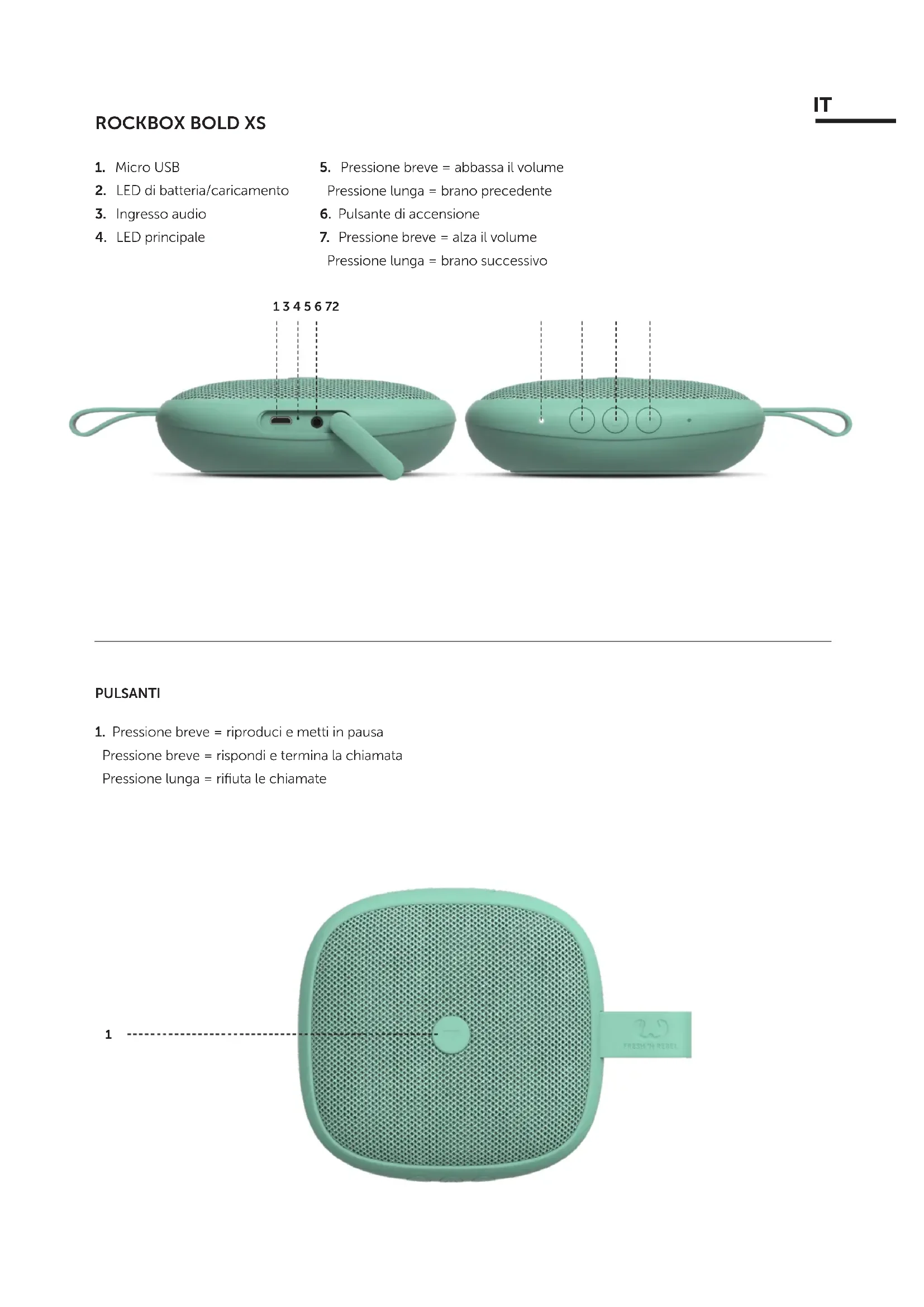 Altoparlante (1) a sinistra Altoparlante (2) a destra ITAPRI BENE LE ORECCHIE! Hai problemi con la connessione? Quando l’altoparlante viene acceso, cercherà di ricollegarsi all’ultimo dispositivo. Se non lo trova scatterà la modalità di accoppiamento. Vuoi collegare un altro dispositivo? Scollegando gli altri dispositivi da Bold XS, la modalità di accoppiamento si attiva automaticamente. Senti un segnale acustico? La batteria si sta scaricando. Ti avviseremo quando la capacità residua sarà del 20, 15 e 10%. L’altoparlante si è spento? La carica della batteria era inferiore al 5%. Carica l’altoparlante per farlo ripartire! L’altoparlante si è disattivato? Non hai ascoltato musica negli ultimi 30 minuti oppure ti sei dimenticato di spegnere l’altoparlante? Spegni e riaccendi l’altoparlante per continuare a sentire la musica. Problemi con la garanzia? La garanzia standard di due anni del negozio è valida soltanto se si esibisce una prova d’acquisto o una copia con la fattura originale indicante data d’acquisto e codice del prodotto. Rivolgiti al negozio in cui hai acquistato il prodotto Fresh ‘n Rebel per presentare la richiesta di intervento in garanzia. Vedi anche Garanzia e limitazioni. La tua domanda non è presente? Siamo qui per aiutarti! Scrivici due righe: helpme@freshnrebel.com