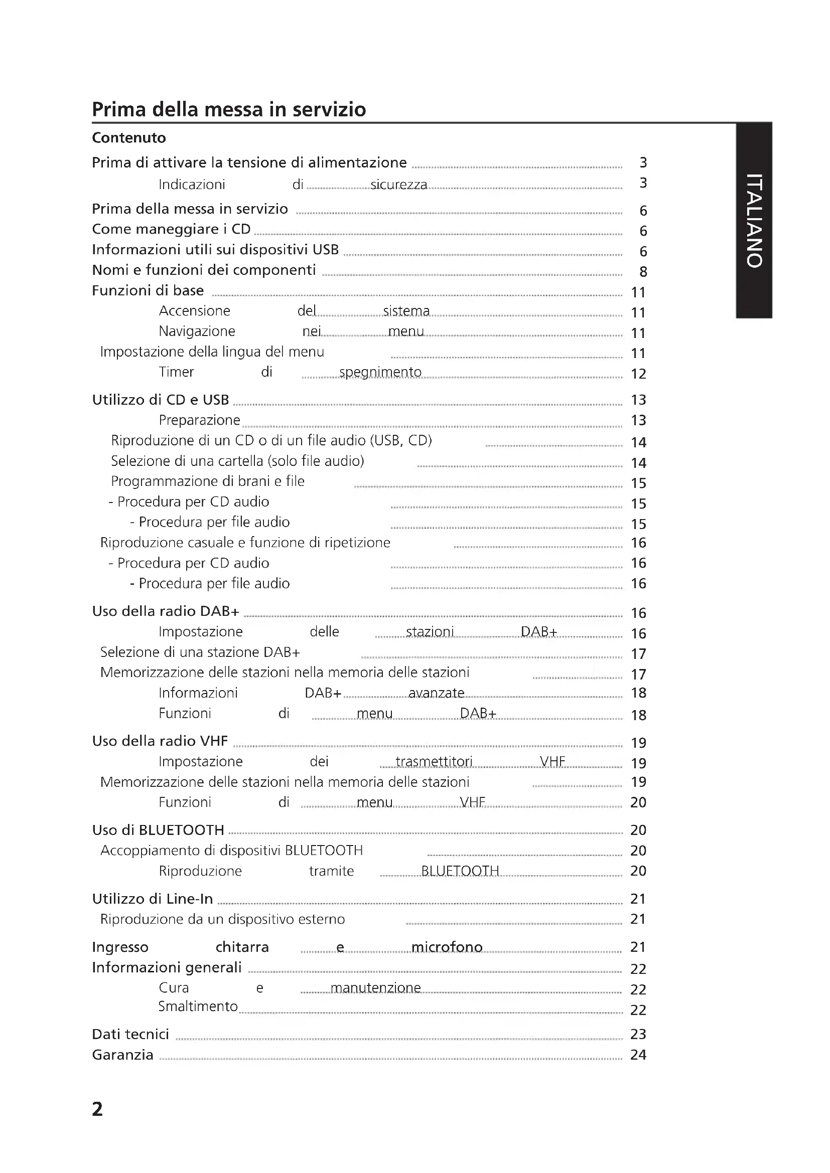 JVCKENWOOD Corporation DEUTSCH FRANÇAIS ITALIANOENGLISH NEDERLANDS22 Prima della messa in servizio ITALIANO Contenuto Prima di attivare la tensione di alimentazione Indicazioni di sicurezza Prima della messa in servizio Come maneggiare i CD Informazioni utili sui dispositivi USB Nomi e funzioni dei componenti Funzioni di base Accensione del sistema Navigazione nei menu Impostazione della lingua del menu Timer di spegnimento Utilizzo di CD e USB Preparazione RiproduzionediunCDodiunleaudio(USB,CD) Selezionediunacartella(sololeaudio) Programmazionedibraniele - Procedura per CD audio -Proceduraperleaudio Riproduzione casuale e funzione di ripetizione - Procedura per CD audio -Proceduraperleaudio Uso della radio DAB+ Impostazione delle stazioni DAB+ Selezione di una stazione DAB+ Memorizzazione delle stazioni nella memoria delle stazioni Informazioni DAB+ avanzate Funzioni di menu DAB+ Uso della radio VHF Impostazione dei trasmettitori VHF Memorizzazione delle stazioni nella memoria delle stazioni Funzioni di menu VHF Uso di BLUETOOTH Accoppiamento di dispositivi BLUETOOTH Riproduzione tramite BLUETOOTH Utilizzo di Line-In Riproduzione da un dispositivo esterno Ingresso chitarra e microfono Informazioni generali Cura e manutenzione Smaltimento Dati tecnici Garanzia
