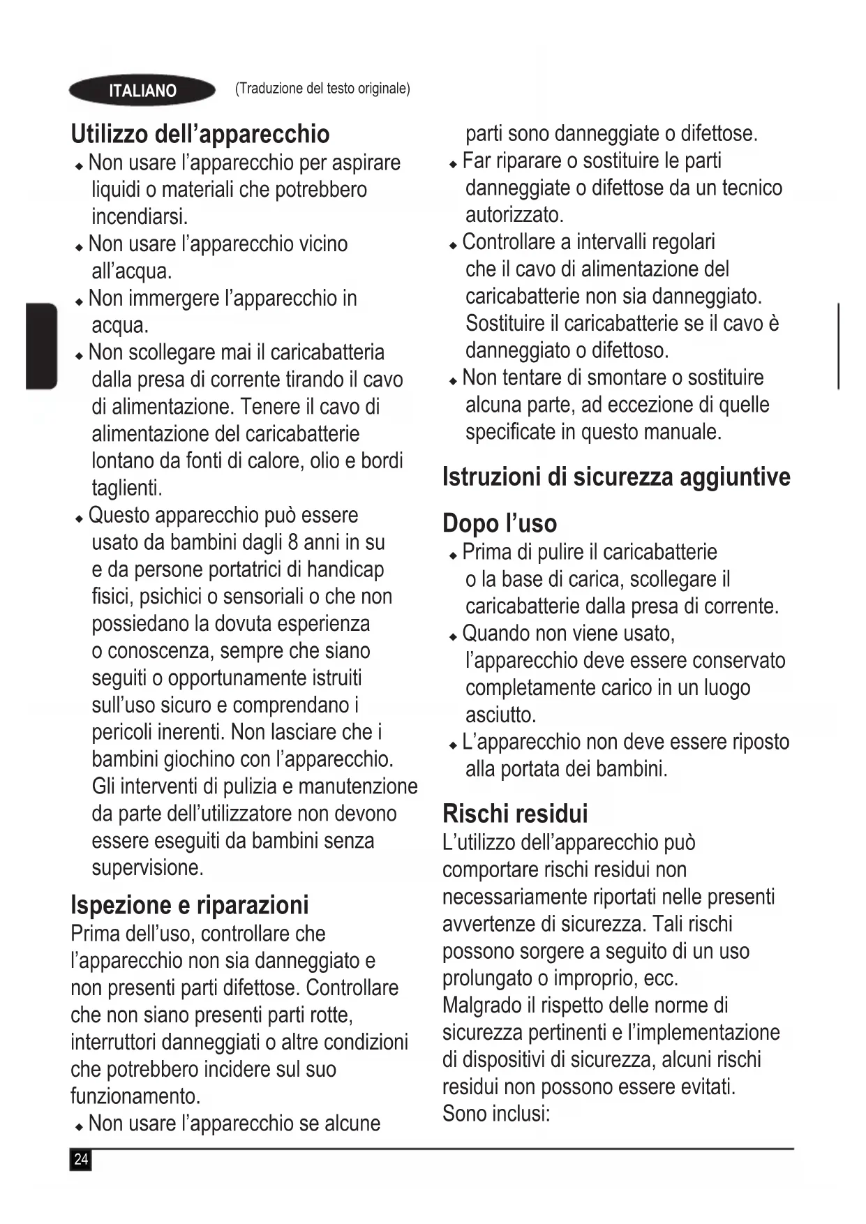 Avvertenza! Leggere attentamente tutte le avvertenze e le istruzioni. L’inosservanza delle avvertenze e istruzioni elencate di seguito potrebbe dar luogo a scossa elettrica, incendi e/o lesioni gravi alle persone. u L’uso previsto è descritto in questo manuale. Se questo apparecchio viene utilizzato con accessori o per impieghi diversi da quelli raccomandati in questo manuale si potrebbero vericare lesioni alle persone. u Conservare questo manuale per successiva consultazione. u Questo apparecchio contiene batterie che possono essere sostituite solo da persone qualicate.24 (Traduzione del testo originale) ITALIANO Utilizzo dell’apparecchio u Non usare l’apparecchio per aspirare liquidi o materiali che potrebbero incendiarsi. u Non usare l’apparecchio vicino all’acqua. u Non immergere l’apparecchio in acqua. u Non scollegare mai il caricabatteria dalla presa di corrente tirando il cavo di alimentazione. Tenere il cavo di alimentazione del caricabatterie lontano da fonti di calore, olio e bordi taglienti. u Questo apparecchio può essere usato da bambini dagli 8 anni in su e da persone portatrici di handicap sici, psichici o sensoriali o che non possiedano la dovuta esperienza o conoscenza, sempre che siano seguiti o opportunamente istruiti sull’uso sicuro e comprendano i pericoli inerenti. Non lasciare che i bambini giochino con l’apparecchio. Gli interventi di pulizia e manutenzione da parte dell’utilizzatore non devono essere eseguiti da bambini senza supervisione. Ispezione e riparazioni Prima dell’uso, controllare che l’apparecchio non sia danneggiato e non presenti parti difettose. Controllare che non siano presenti parti rotte, interruttori danneggiati o altre condizioni che potrebbero incidere sul suo funzionamento. u Non usare l’apparecchio se alcune parti sono danneggiate o difettose. u Far riparare o sostituire le parti danneggiate o difettose da un tecnico autorizzato. u Controllare a intervalli regolari che il cavo di alimentazione del caricabatterie non sia danneggiato. Sostituire il caricabatterie se il cavo è danneggiato o difettoso. u Non tentare di smontare o sostituire alcuna parte, ad eccezione di quelle specicate in questo manuale. Istruzioni di sicurezza aggiuntive Dopo l’uso u Prima di pulire il caricabatterie o la base di carica, scollegare il caricabatterie dalla presa di corrente. u Quando non viene usato, l’apparecchio deve essere conservato completamente carico in un luogo asciutto. u L’apparecchio non deve essere riposto alla portata dei bambini. Rischi residui L’utilizzo dell’apparecchio può comportare rischi residui non necessariamente riportati nelle presenti avvertenze di sicurezza. Tali rischi possono sorgere a seguito di un uso prolungato o improprio, ecc. Malgrado il rispetto delle norme di sicurezza pertinenti e l’implementazione di dispositivi di sicurezza, alcuni rischi residui non possono essere evitati. Sono inclusi:25 (Traduzione del testo originale)ITALIANOu lesioni causate o subite a seguito del contatto con parti rotanti/in movimento; u lesioni causate o subite durante la sostituzione di parti, lame o accessori u lesioni causate dall’impiego prolungato di un apparecchio (quando si utilizza qualsiasi apparecchio per lunghi periodi, accertarsi di fare regolarmente delle pause); u menomazioni uditive;u rischi per la salute causati dall’aspirazione di polvere generata dall’utilizzo dell’apparecchio (ad esempio, quando si lavora con il legno, in modo particolare quello di quercia, faggio o l’MDF). Caricabatterie Il caricabatterie è stato progettato per una tensione specica. Controllare sempre che la tensione di rete corrisponda a quella indicata sulla targhetta dei valori nominali. Avvertenza! Non tentare mai di sostituire il caricabatterie con una spina elettrica tradizionale. u Usare il caricabatterie BLACK+DECKER solo per caricare la batteria dell’apparecchio con il quale è stato fornito. Batterie diverse potrebbero scoppiare, causando lesioni a persone e danni alle cose. u Non tentare mai di caricare batterie non ricaricabili. u In caso di danneggiamento del cavo di alimentazione, farlo riparare dal produttore o presso un Centro di assistenza BLACK+DECKER autorizzato, in modo da evitare pericoli. u Non lasciare che il caricabatterie si bagni. u Non aprire il caricabatterie.u Non collegare il caricabatterie a sonde.u L’apparecchio o la batteria devono essere lasciati in una zona ben ventilata durante la carica. Sicurezza elettrica Simboli sul caricabatterie Leggere attentamente il presente manuale prima di usare l’apparecchio. Il doppio isolamento di cui è provvisto l’apparecchio rende superuo il lo di terra. Assicurarsi che la tensione della rete di alimentazione corrisponda al valore indicato sulla targhetta dei valori nominali. La base di carica è destinata esclusivamente all’uso in ambienti interni.Etichette sull’apparecchioSull’apparecchio sono presenti i seguenti simboli assieme al codice dataLeggere attentamente questo manuale prima di usare l'apparecchioUtilizzare esclusivamente con il caricabatte-rie S013C-33-40 Caratteristiche Questo apparecchio presenta alcune o tutte le seguenti caratteristiche. 1. Interruttore di accensione/spegnimento 2. Impugnatura 2a. Tracolla 3. Manico di prolunga3a. Attacco del tubo essibile3b. Fermo del tubo di prolunga 4. Bocchetta a lancia estensibile 5. Aspirapolvere rimovibile 5a. Recipiente di raccolta polvere 6. Coperchio recipiente di raccolta polvere 7. Base di carica 7a. Vano accessori S013C-33-4026 (Traduzione del testo originale) ITALIANO