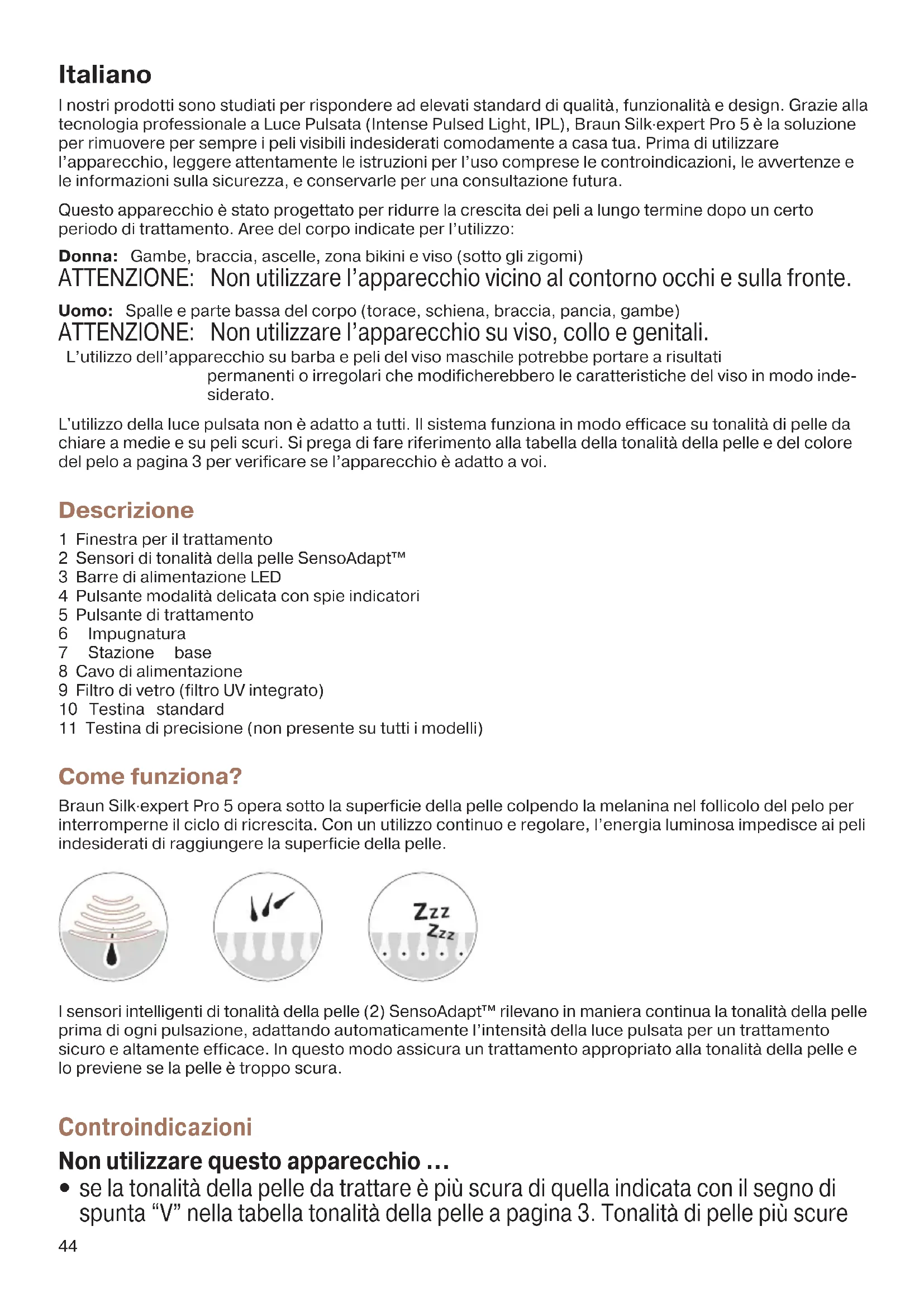 Se si possiede almeno una delle caratteristiche elencate, questo apparecchio può causare danni alla pelle o peggiorare la situazione attuale. Si potrebbero verificare effetti collaterali quali ustioni, vesciche e cambiamenti di colore della pelle (iper o ipo-pigmentazione) o cicatrici. Consultare il proprio medico o dermatologo in caso di incertezza sui benefici dell’utilizzo dell’apparecchio. Se si sta assumendo in modo regolare e per un periodo prolungato qualsiasi tipo di farmaco, si prega di consultare il proprio medico per evitare qualsiasi potenziale impatto sulla sensibilità della pelle alla luce. Avvertenze Non utilizzare su ...