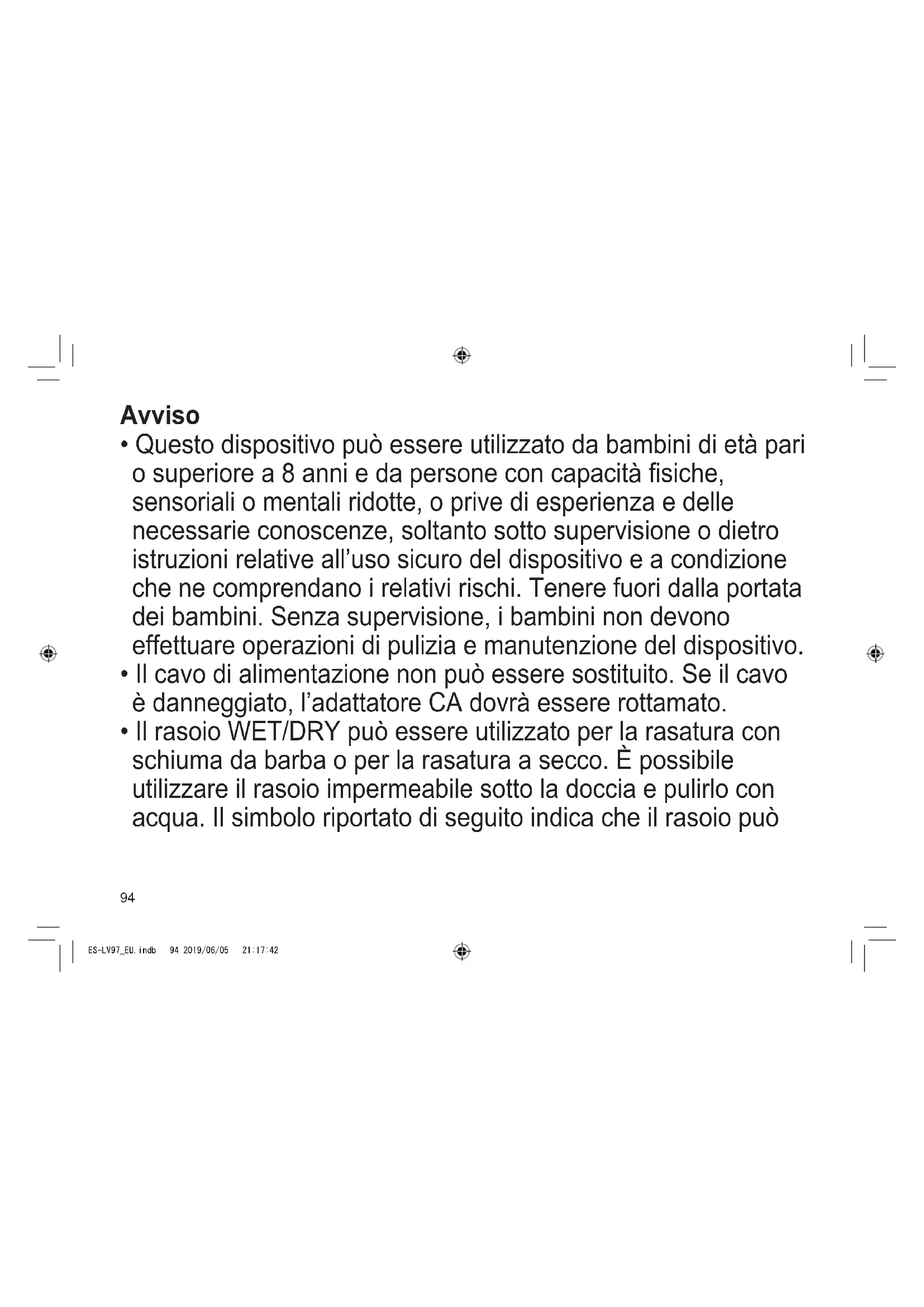- Il rasoio WET/DRY può essere utilizzato per la rasatura con schiuma da barba o per la rasatura a secco. È possibile utilizzare il rasoio impermeabile sotto la doccia e pulirlo con acqua. Il simbolo riportato di seguito indica che il rasoio può ES-LV97_EU.indb 94 2019/06/05 21:17:4295 TR RO H SK CZ PL FIN S N P DK E NL I F D GB essere utilizzato in una vasca da bagno o sotto la doccia.