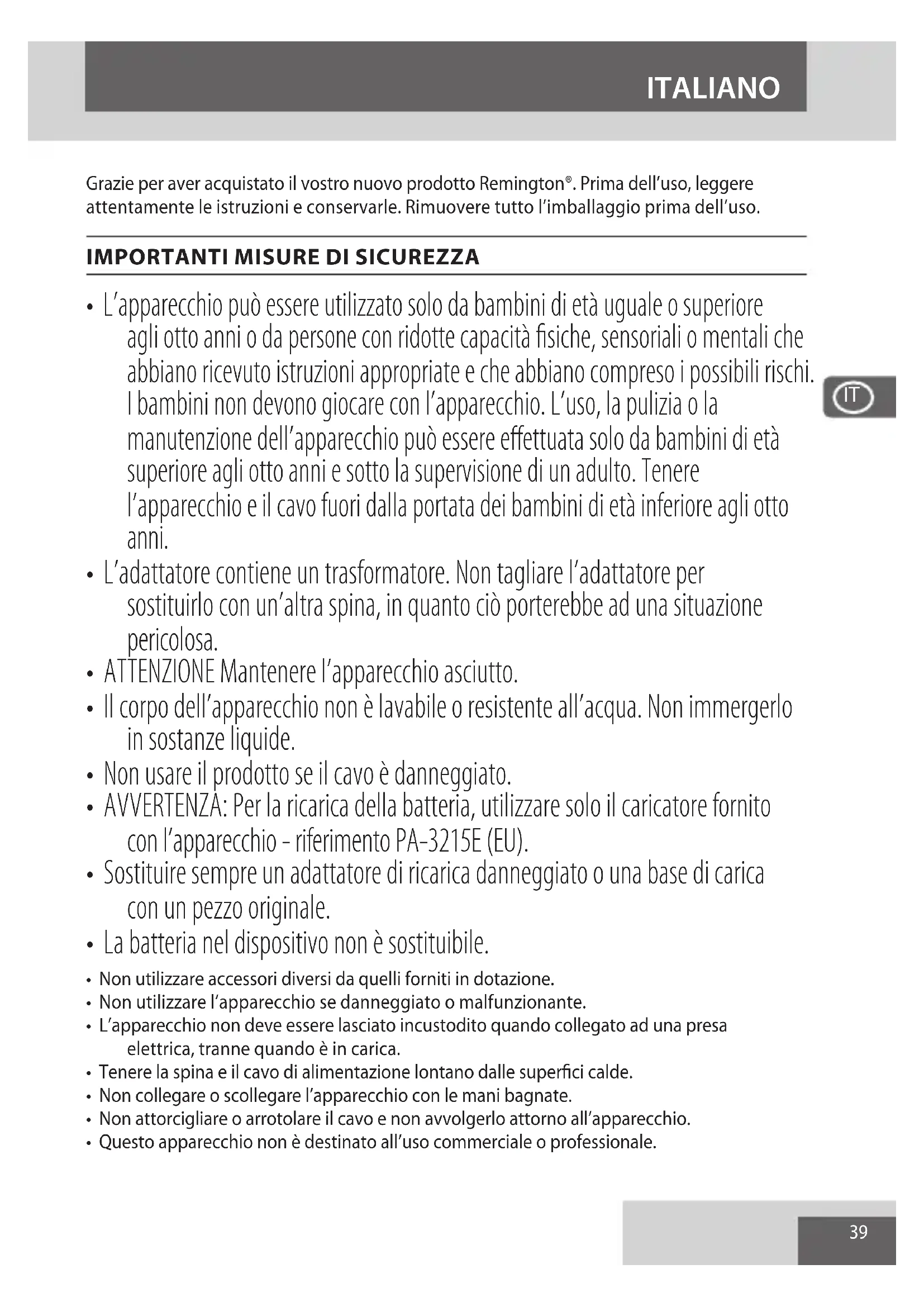 Grazie per aver acquistato il vostro nuovo prodotto Remington®. Prima dell’uso, leggere attentamente le istruzioni e conservarle. Rimuovere tutto l’imballaggio prima dell’uso.