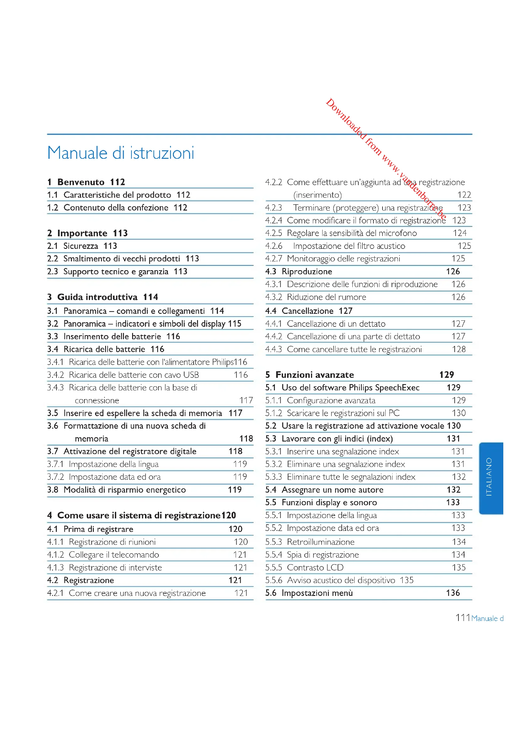 Downloaded from www.vandenborre.be112 Manuale di istruzioni Benvenuto1 Congratulazioni per l’acquisto e benvenuto da Philips! Per poter beneficiare del servizio oerto da Philips, sul nostro sito web sono disponibili informazioni di supporto quali manuali per l’utente, download di software, informazioni sulla garanzia e altro ancora: www.philips.com/welcome. Caratteristiche del prodotto1.1 Soluzione pronta per l• ’uso e semplice da usare Elegante custodia da trasporto in metallo per • la massima portabilità Impostazione rapida con innovativi microfoni • per conferenze Rilevazione audio a 360 gradi per una • registrazione ottimale Design con strato di sbarramento con • pressione audio Sistema di conservazione dei cavi integrato e • adattamento della lunghezza Espandibile tramite operazioni a catena• Download automatico dei file tramite USB • per una rapida trascrizione Scheda di memoria intercambiabile per • registrazioni illimitate Qualità di registrazione elevata in formato • DSS, MP3 e PCM Contenuto della confezione1.2 Registratore digitale For product information and support, visitwww.philips.com/dictationLFH0955Conference recording system with SpeechExec dictation software POCKET MEMO