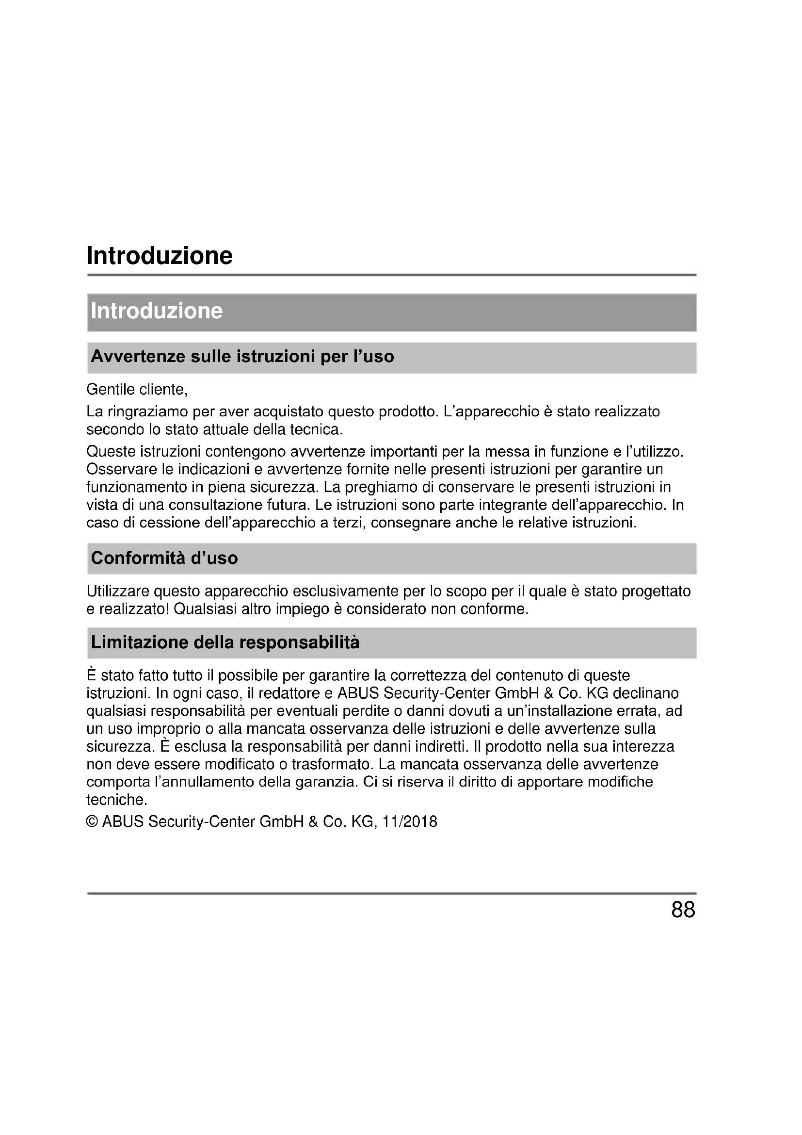 Introduzione Avvertenze sulle istruzioni per l’uso Gentile cliente, La ringraziamo per aver acquistato questo prodotto. L’apparecchio è stato realizzato secondo lo stato attuale della tecnica. Queste istruzioni contengono avvertenze importanti per la messa in funzione e l’utilizzo. Osservare le indicazioni e avvertenze fornite nelle presenti istruzioni per garantire un funzionamento in piena sicurezza. La preghiamo di conservare le presenti istruzioni in vista di una consultazione futura. Le istruzioni sono parte integrante dell’apparecchio. In caso di cessione dell’apparecchio a terzi, consegnare anche le relative istruzioni. Conformità d’uso Utilizzare questo apparecchio esclusivamente per lo scopo per il quale è stato progettato e realizzato! Qualsiasi altro impiego è considerato non conforme. Limitazione della responsabilità È stato fatto tutto il possibile per garantire la correttezza del contenuto di queste istruzioni. In ogni caso, il redattore e ABUS Security-Center GmbH & Co. KG declinano qualsiasi responsabilità per eventuali perdite o danni dovuti a un’installazione errata, ad un uso improprio o alla mancata osservanza delle istruzioni e delle avvertenze sulla sicurezza. È esclusa la responsabilità per danni indiretti. Il prodotto nella sua interezza non deve essere modificato o trasformato. La mancata osservanza delle avvertenze comporta l’annullamento della garanzia. Ci si riserva il diritto di apportare modifiche tecniche. © ABUS Security-Center GmbH & Co. KG, 11/2018Avvertenze di sicurezza
