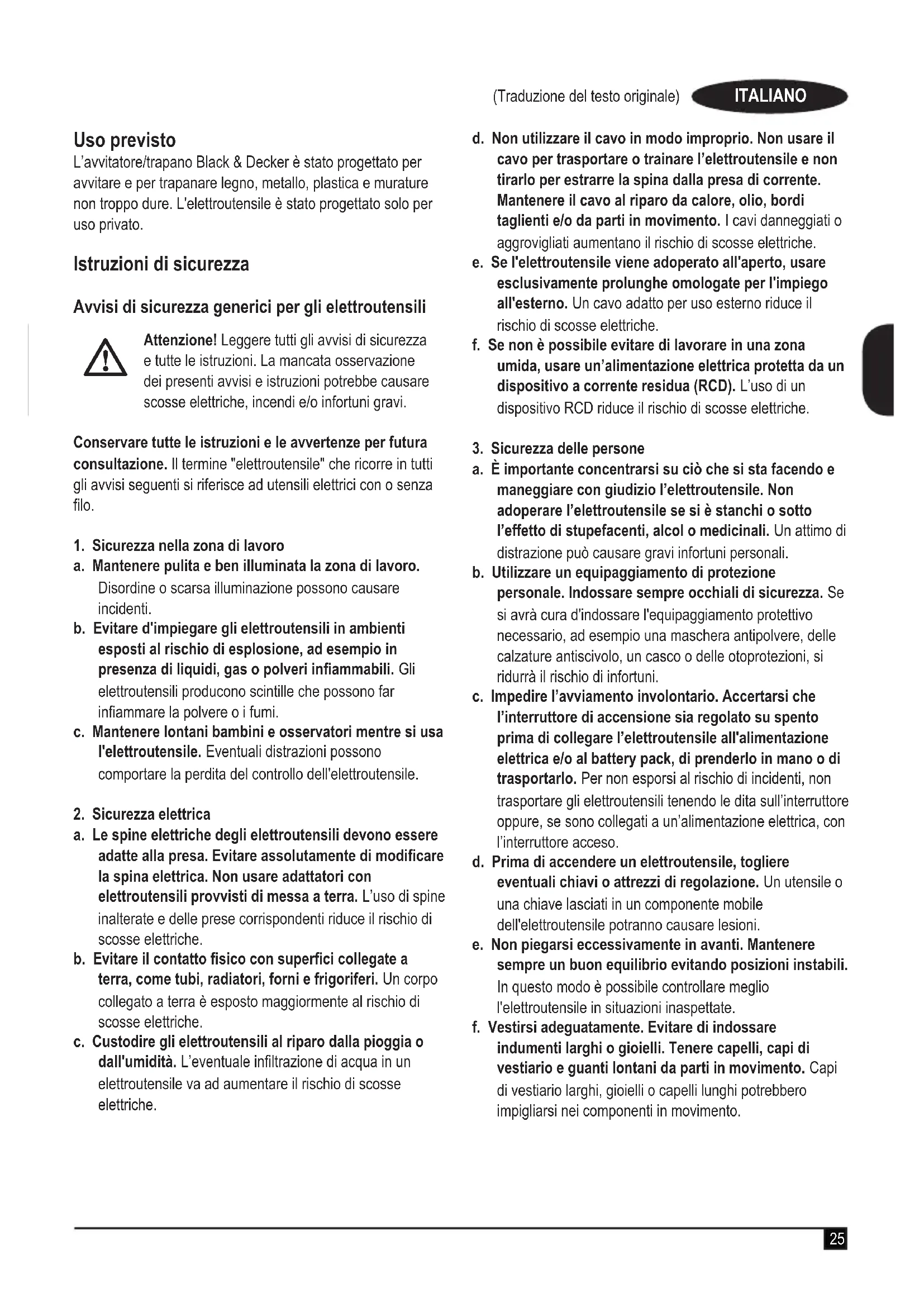 che aiuta ad avvitare le viti in modo preciso e senza alcuno sforzo. u Selezionare la modalità cacciavite e vericare che il pulsante avanti/indietro (2) sia spostato verso sinistra. u Tirare l'interruttore a grilletto (1) per avvitare la vite nel pezzo: l'elettroutensile si fermerà automaticamente quando la vite si trova a lo del pezzo. u Se si desidera avvitare più profondamente la vite, con- tinuare a tenere premuto l'interruttore a grilletto. Dopo un attimo, il trapano comincerà a ruotare per avvitare la vite alla profondità desiderato a un ritmo più controllabile. u Una volta raggiunta la profondità richiesta, l’interruttore a grilletto. Nota: Se la vite si ferma a metà strada, rilasciare il gril- letto (1), quindi premere il grilletto (1) per ricominciare. Indicatore dello stato di carica (g. D) L'elettroutensile è dotato di indicatore dello stato di carica. Esso può essere usato per indicare il livello attuale di carica della batteria durante l'impiego. u Premere o il pulsante della modalità trapano (3) o quello della modalità cacciavite (4) per visualizzare lo stato at- tuale della carica. Luce di lavoro a LED La luce di lavoro a LED (8) è attivata automaticamente quando si preme l'interruttore a grilletto. La luce di lavoro a LED si accende quando la levetta è premuta a metà, prima che l’elettroutensile cominci a funzionare. Consigli per un utilizzo ottimale Trapanatura u Esercitare sempre una pressione leggera in linea retta con la punta da trapano. u Appena prima che la punta esca dal lato op- posto del pezzo in lavorazione, diminuire la pressione sull'elettroutensile. u Usare un blocchetto di legno per rinforzare i pezzi che potrebbero scheggiarsi. u Usare punte a lancia quando si trapano fori di grandi dimensioni nel legno. u Usare punte da trapano in acciaio super rapido (HSS) quando si trapana il metallo. u Usare un lubricante quando si trapano metalli ad ec- cezione della ghisa e dell'ottone. u Praticare una tacca con un punteruolo al centro del foro da trapanare per migliorare la precisione.30 (Traduzione del testo originale) ITALIANO Avvitatura u Usare sempre la punta di cacciavite di tipo e misura cor- retti. u Se le viti sono dure da avvitare, versare una piccola quantità di detersivo o sapone per lubricarle. u Tenere sempre l’elettroutensile e la punta del cacciavite in posizione perpendicolare rispetto alla vite. Manutenzione Questo elettroutensile Black & Decker è stato progettato per funzionare a lungo con una manutenzione minima. Per ottenere prestazioni sempre soddisfacenti occorre avere cura dell'elettroutensile e sottoporlo a manutenzione periodica. L’alimentatore non richiede nessuna manutenzione salvo una regolare pulitura. Avvertenza! Prima di eseguire interventi di manutenzi- one sull’elettroutensile, estrarre la batteria. Scollegare l’alimentatore dalla spina prima di pulirlo. u Pulire regolarmente le prese di ventilazione dell’elettroutensile e dell’alimentatore con un pennello o con un panno morbido e asciutto. u Il vano del motore deve essere pulito regolarmente con un panno umido. Non usare materiali abrasivi o detergenti a base di solventi. u Aprire regolarmente il mandrino e batterlo leggermente per eliminare la polvere dall’interno. Protezione dell’ambiente