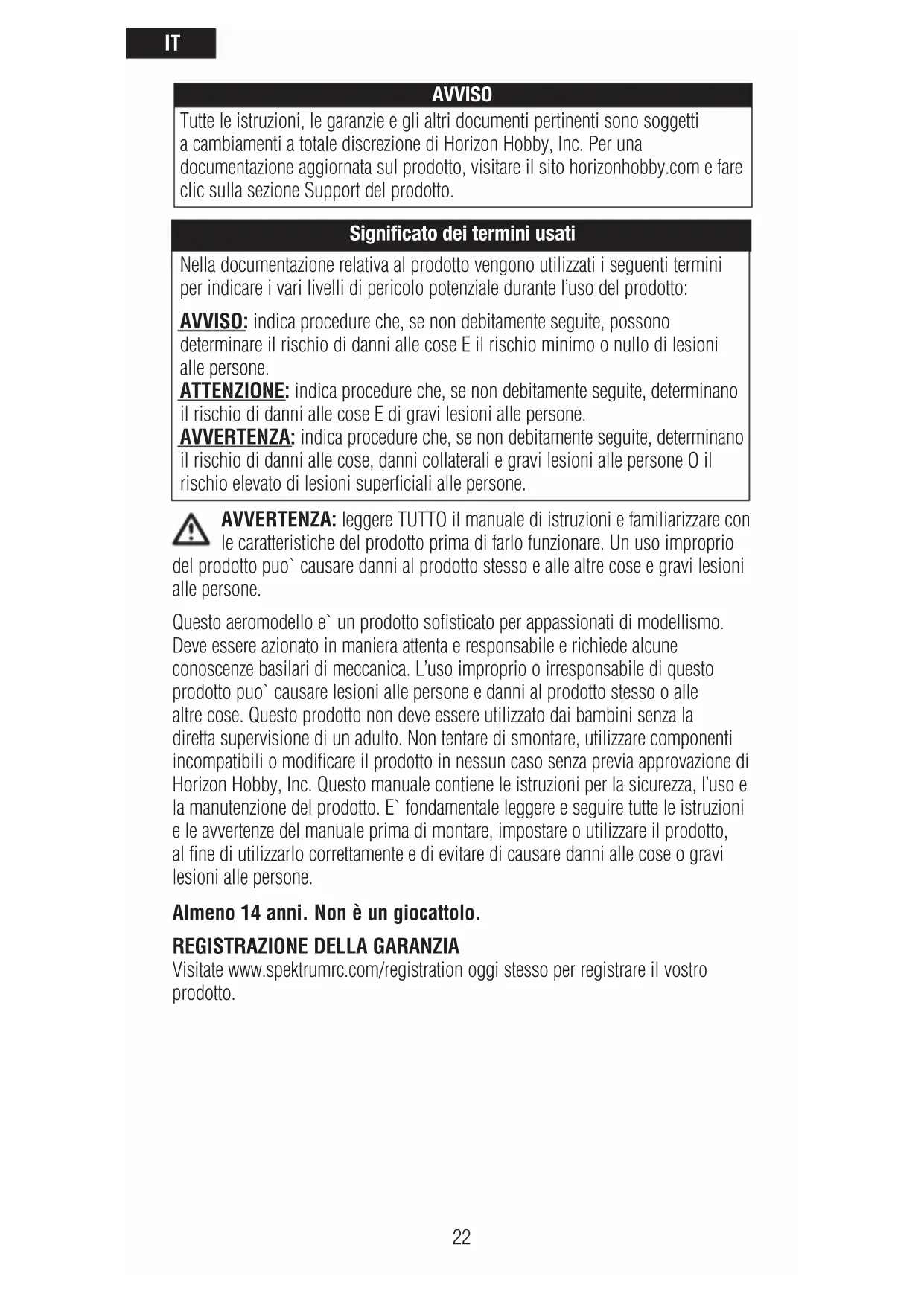Visitate www.spektrumrc.com/registration oggi stesso per registrare il vostro prodotto. Nella documentazione relativa al prodotto vengono utilizzati i seguenti termini per indicare i vari livelli di pericolo potenziale durante l’uso del prodotto: AVVISO: indica procedure che, se non debitamente seguite, possono determinare il rischio di danni alle cose E il rischio minimo o nullo di lesioni alle persone. ATTENZIONE: indica procedure che, se non debitamente seguite, determinano il rischio di danni alle cose E di gravi lesioni alle persone. AVVERTENZA: indica procedure che, se non debitamente seguite, determinano il rischio di danni alle cose, danni collaterali e gravi lesioni alle persone O il rischio elevato di lesioni superficiali alle persone. Significato dei termini usatiIT