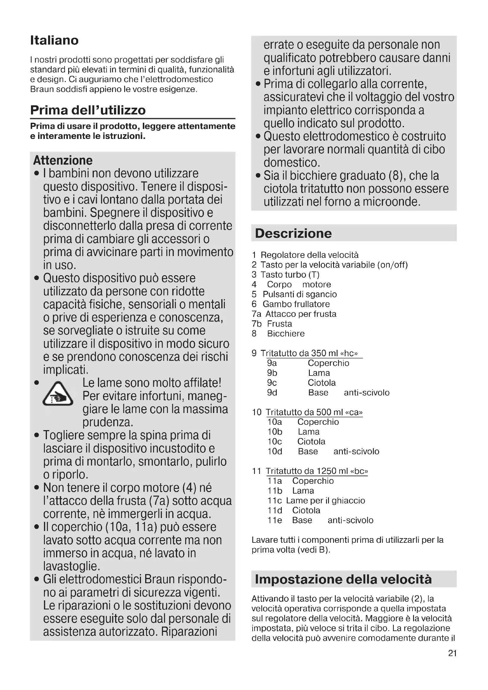 Sia il bicchiere graduato (8), che la ciotola tritatutto non possono essere utilizzati nel forno a microonde. Descrizione 1 Regolatore della velocità 2 Tasto per la velocità variabile (on/off) 3 Tasto turbo (T) 4 Corpo motore 5 Pulsanti di sgancio 6 Gambo frullatore 7a Attacco per frusta 7b Frusta 8 Bicchiere 9 Tritatutto da 350 ml «hc» 9a Coperchio 9b Lama 9c Ciotola 9d Base anti-scivolo 10 Tritatutto da 500 ml «ca» 10a Coperchio 10b Lama 10c Ciotola 10d Base anti-scivolo 11 Tritatutto da 1250 ml «bc» 11a Coperchio 11b Lama 11c Lame per il ghiaccio 11d Ciotola 11e Base anti-scivolo Lavare tutti i componenti prima di utilizzarli per la prima volta (vedi B). Impostazione della velocità Attivando il tasto per la velocità variabile (2), la velocità operativa corrisponde a quella impostata sul regolatore della velocità. Maggiore è la velocità impostata, più veloce si trita il cibo. La regolazione della velocità può avvenire comodamente durante il 5722111864_MQ5000-MQ5045_INT_S6-80.indd 21 30.09.15 11:1422 funzionamento, ruotando il regolatore della velocità con il pollice o l’indice. Per raggiungere la velocità massima, invece, è necessario premere il tasto turbo (3). È inoltre possibile utilizzare il tasto turbo per generare rapidi impulsi di potenza massima senza dover manipolare il regolatore della velocità. Frullatore a immersione Il frullatore a immersione è perfetto per preparare intingoli, salse, zuppe, maionese, pappe per bambini oltre a frullati, frappè, cocktail. Per ottenere risultati ottimali di miscelazione impostare la velocità massima.