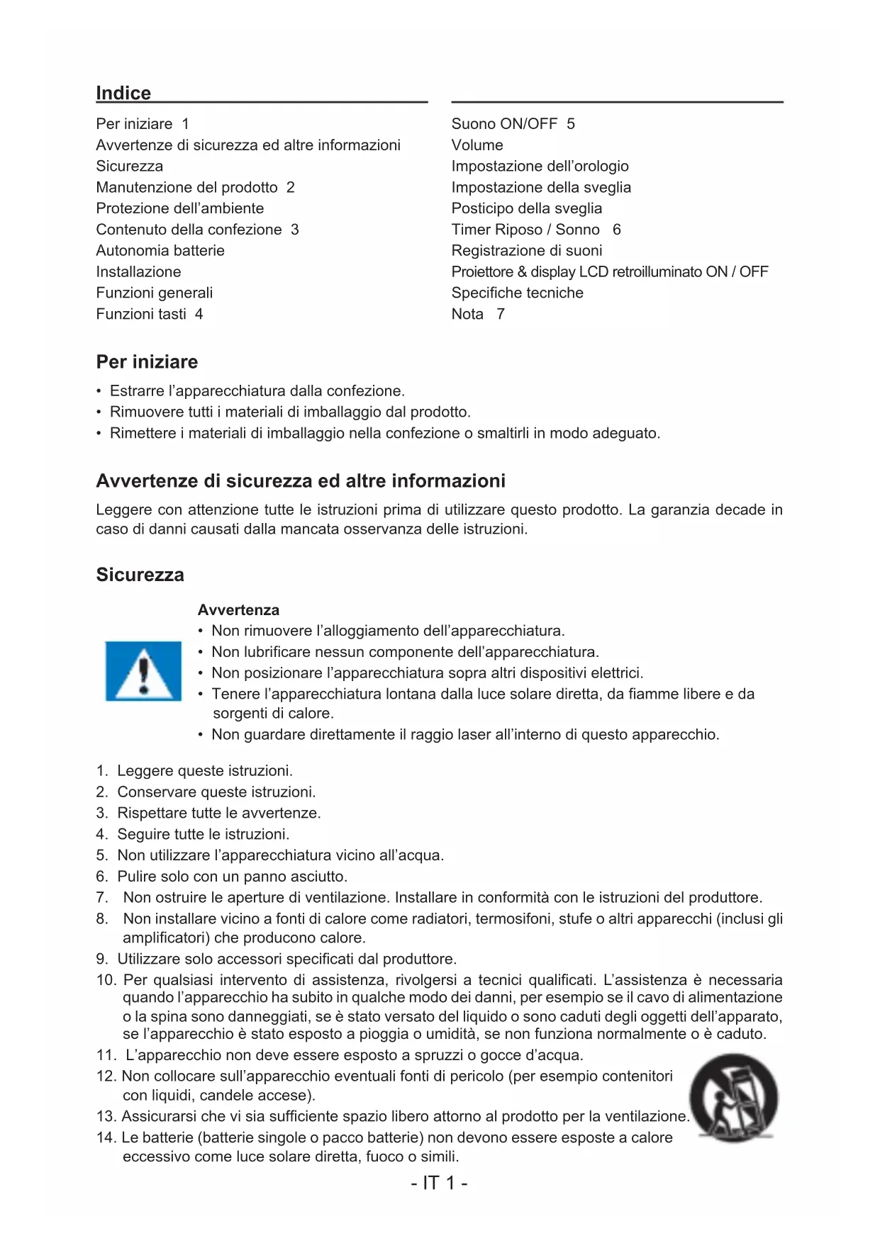 INTERO IL PRESENTE MANUALE E CONSERVARLO PER CONSULTAZIONI FUTURE. IT- IT 1 - Indice Per iniziare 1 Avvertenze di sicurezza ed altre informazioni Sicurezza Manutenzione del prodotto 2 Protezione dell’ambiente Contenuto della confezione 3 Autonomia batterie Installazione Funzioni generali Funzioni tasti 4 Suono ON/OFF 5 Volume Impostazione dell’orologio Impostazione della sveglia Posticipo della sveglia Timer Riposo / Sonno 6 Registrazione di suoni Proiettore & display LCD retroilluminato ON / OFF Specichetecniche Nota 7 Per iniziare