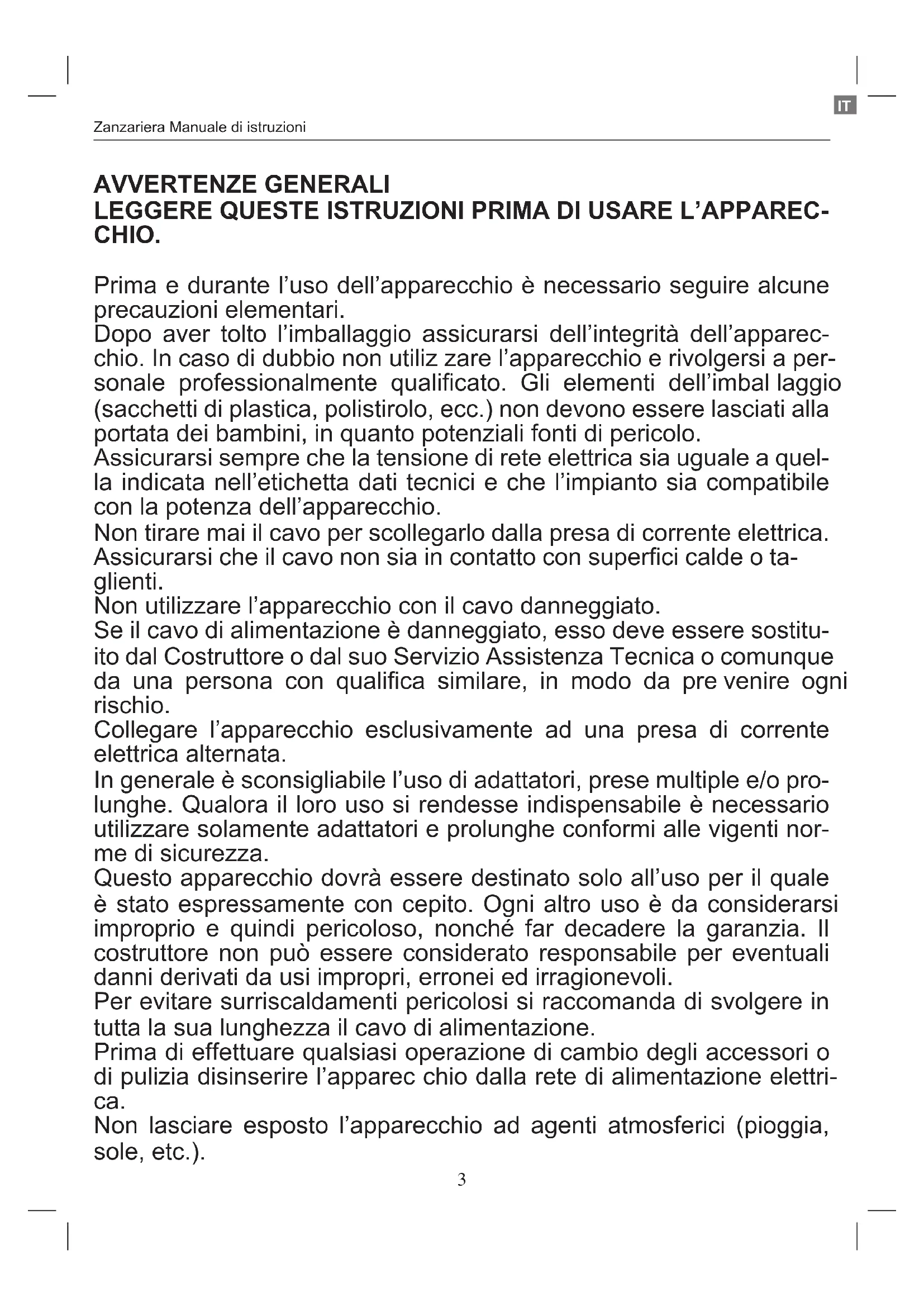 Non coprire la zanzariera con tessuti o altri materiali; questa operazione è estremamente pericolosa e potrebbe provare gravi incendi.