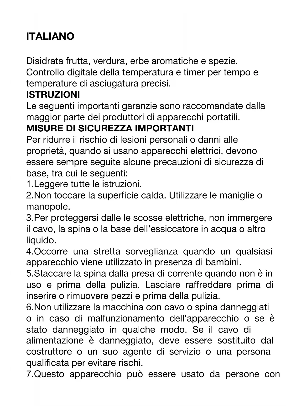 Per ridurre il rischio di lesioni personali o danni alle proprietà, quando si usano apparecchi elettrici, devono essere sempre seguite alcune precauzioni di sicurezza di base, tra cui le seguenti: 1.Leggere tutte le istruzioni. 2.Non toccare la superficie calda. Utilizzare le maniglie o manopole. 3.Per proteggersi dalle le scosse elettriche, non immergere il cavo, la spina o la base dell’essiccatore in acqua o altro liquido. 4.Occorre una stretta sorveglianza quando un qualsiasi apparecchio viene utilizzato in presenza di bambini. 5.Staccare la spina dalla presa di corrente quando non è in uso e prima della pulizia. Lasciare raffreddare prima di inserire o rimuovere pezzi e prima della pulizia. 6.Non utilizzare la macchina con cavo o spina danneggiati o in caso di malfunzionamento dell'apparecchio o se è stato danneggiato in qualche modo. Se il cavo di alimentazione è danneggiato, deve essere sostituito dal costruttore o un suo agente di servizio o una persona qualificata per evitare rischi. 7.Questo apparecchio può essere usato da persone conridotte capacità fisiche, sensoriali o mentali o con mancanza di esperienza o conoscenza, a condizione che siano sorvegliate o istruite sull'uso sicuro dell'apparecchio e che comprendano pienamente i potenziali pericoli. 8.L'uso di accessori non consigliati dal produttore possono causare lesioni. 9.Non lasciate che il cavo penda dal bordo del tavolo o banco o tocchi superfici calde. 10.Non utilizzare all'aperto. 11.Non posizionare sopra o vicino a fornelli a gas o elettrici o in un forno caldo. 12.Non utilizzare questo apparecchio per disidratare gli alimenti che contengono alcol o sono stati in alcol. 13.Non utilizzare apparecchi per uso diverso da quello previsto. 14.La pulizia e la manutenzione non devono essere eseguite da bambini a meno che abbiano più di 8 anni e siano sorvegliati da un adulto. 15.Conservare l'apparecchio e il cavo di alimentazione fuori dalla portata di bambini di età inferiore a 8 anni. 16.Quando si utilizzano apparecchiature elettriche, è necessario adottare sempre misure di sicurezza per prevenire il rischio di incendi, scosse elettriche e/o lesioni in caso di uso improprio. 17.Accertarsi che la tensione nominale sulla targhetta corrisponda alla tensione principale della vostra installazione. In caso contrario, contattare il rivenditore e non collegare l'unità. 18.Non lasciare mai l'unità incustodita durante il funzionamento.19.L'apparecchio è stato progettato esclusivamente per uso domestico. Non è stato progettato per essere utilizzato nei seguenti casi non coperti dalla garanzia: - nelle aree cucina riservate al personale di negozi, uffici e altri ambienti professionali, - nelle locande dell'agriturismo, - da clienti di hotel, motel e altri ambienti residenziali, - in ambienti tipo bed and breakfast.CONSERVARE QUESTE ISTRUZIONI Questo prodotto è solo per uso domestico Come utilizzare il controllo digitale Il controllo digitale (Fig.C) permette una facile regolazione della temperatura di disidratazione. Inoltre, esso si spegne automaticamente quando il tempo di essiccazione selezionato è scaduto. Per regolare la temperatura 3.Prima premere il pulsante start / stop, quindi premere il tasto TIME / TEMP e l'ora nella finestra di visualizzazione inizierà a lampeggiare, quindi premere il tasto + o - per selezionare il tempo desiderato, per modificare l'ora tenere premuto il tasto + o -, il tempo cambierà, la gamma di temporizzatore per questo disidratatore è (1 a 48 ore) 4.Dopo che il timer smette di lampeggiare, premere nuovamente il tasto TIME / TEMP. Premere i tasti + o - per selezionare la temperatura desiderata fino a 1 press. Per modificare la temperatura rapidamente, tenere premuto il tasto + o -. L'intervallo di temperatura di questo disidratatore è 40-70 ℃ Una volta impostato il tempo desiderato e aver impostato la temperatura, l'essiccatore inizierà a funzionare. In qualsiasi momento, è possibile regolare il tempo o la temperatura utilizzando il TIME / TEMP, e i tasti + e -. È possibile interrompere l'essiccatore in qualsiasi momento premendo il pulsante START / STOP. Informazioni Generali Essiccatore Precauzione di sicurezza: Lavare accuratamente le mani prima di preparare il cibo per l’essiccatore. Allo stesso modo, pulire accuratamente tutti gli utensili, taglieri, e i misurini usati per preparare il cibo. Lavare il cibo prima di prepararlo per l’essiccazione. Quando si seleziona il cibo per l'essiccazione, scegliere quello completamente maturo. Evitare * troppo maturi o frutta e verdura acerbi. Rimuovere eventuali parti del cibo marce o rovinate. Per l’essiccamento, tagliare il cibo in dimensioni, forme e spessori uniformi. Il tempo di asciugatura è molto variabile a seconda del tipo e della quantità di cibo, dallo spessore, dall’uniformità dei pezzi dei prodotti alimentari, dall’umidità, dalla temperatura dell'aria, dalle preferenze personali, e anche la maturazione dellapianta al momento della raccolta. È per questo che in tutto il libro si noterà grande varietà di tempi medi di essiccazione. In alcuni casi, potrebbe essere necessario, o si potrebbe preferire, essiccare gli alimenti per un tempo più breve o più lungo di quelli elencati. Per ottenere risultati ottimali, iniziare ad essiccare il cibo all'inizio del range indicato nelle istruzioni. Si dovrebbe quindi valutare ricontrollando il cibo in base a come procede l'essiccazione. Con alcuni alimenti, come le erbe, può significare ogni 10 minuti, e con altri alimenti, come frutta, che può significare ogni 1-2 ore. L’essiccazione impedisce la crescita microbica, tuttavia, un reazione chimica causata dagli enzimi di frutta e verdura può verificarsi se il prodotto non viene pretrattato prima dell’essiccazione. Un pretrattamento consentirà di evitare di ridurre al minimo colori indesiderati o cambiamenti della trama durante l’essiccazione e la conservazione. Vedere le sezioni specifiche per il pretrattament